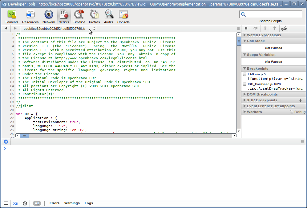 As explained above, Etendo will automatically try to minimize javascript code for best loading performance. However, this makes debugging in the client side very difficult, therefore there is an easy way to prevent minimizing of javascript.