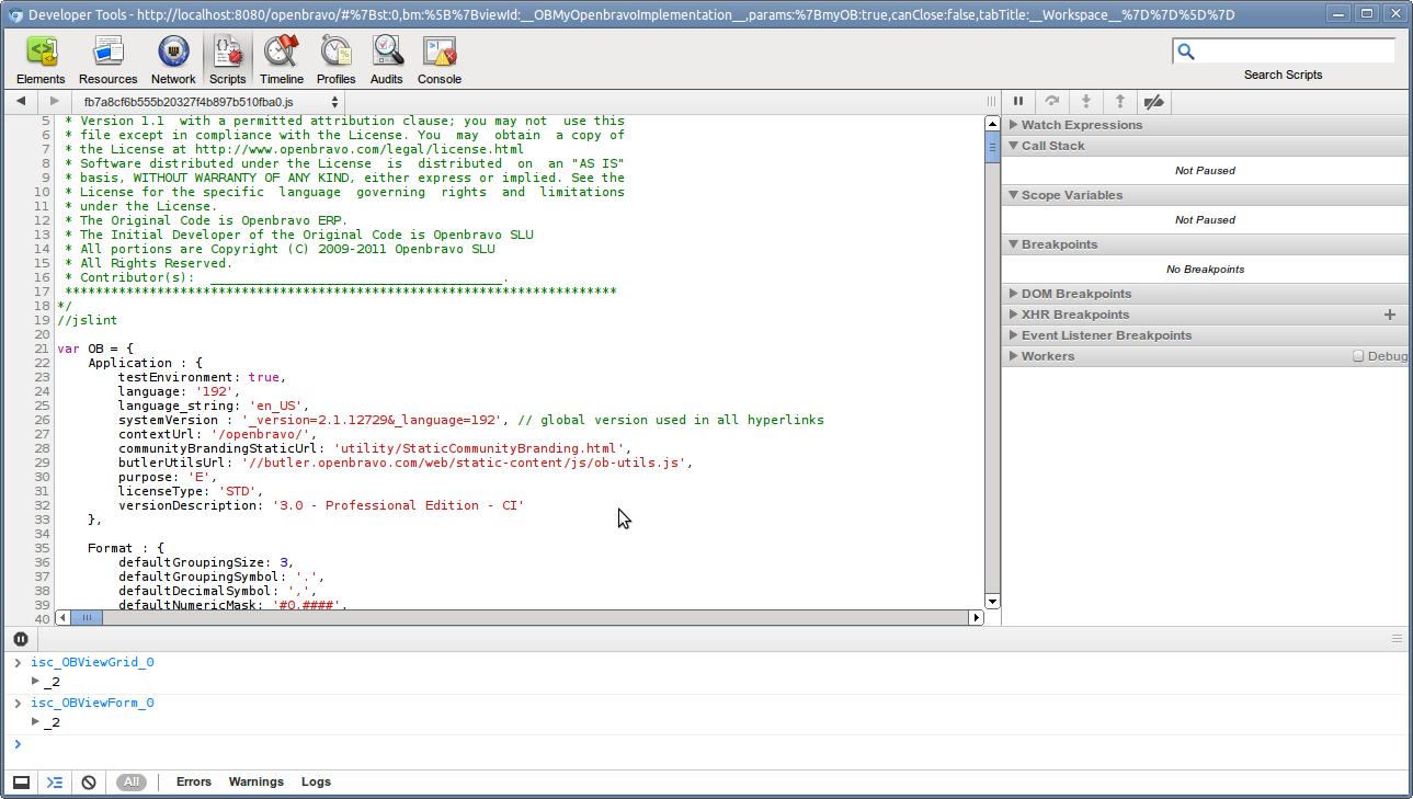 All the static JavaScript code (from all modules) is concatenated into one large JavaScript file which is stored in the web application directory (in web/js/gen). The name of the file is based on a hash of the content (see the image below). You can check out the contents of the file using the browsers debugger. From there, you can debug your code. At Etendo, we use Chromium and its debugger most of the time.