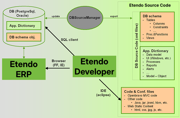Etendo developers have three different ways to develop their code. Following the MDD approach, most common is to edit Etendo Application dictionary through a web browser connected to Etendo. Based on the new model definition the software artifacts can be generated automatically. A developer can also connect directly to the Etendo database through a sql client (eg. pgAdmin, sqlDeveloper) to manage database schema objects (tables, procedures, etc.). Finally developers can develop their own code through an integrated development environment such as Eclipse.