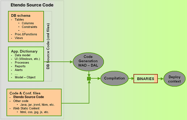 The process to build the system from Etendo source code includes a number of steps to generate the code at different levels (DAL, WAD and others) and put together that code with other code directly written by developers. Etendo has automated this process through an ant task.
