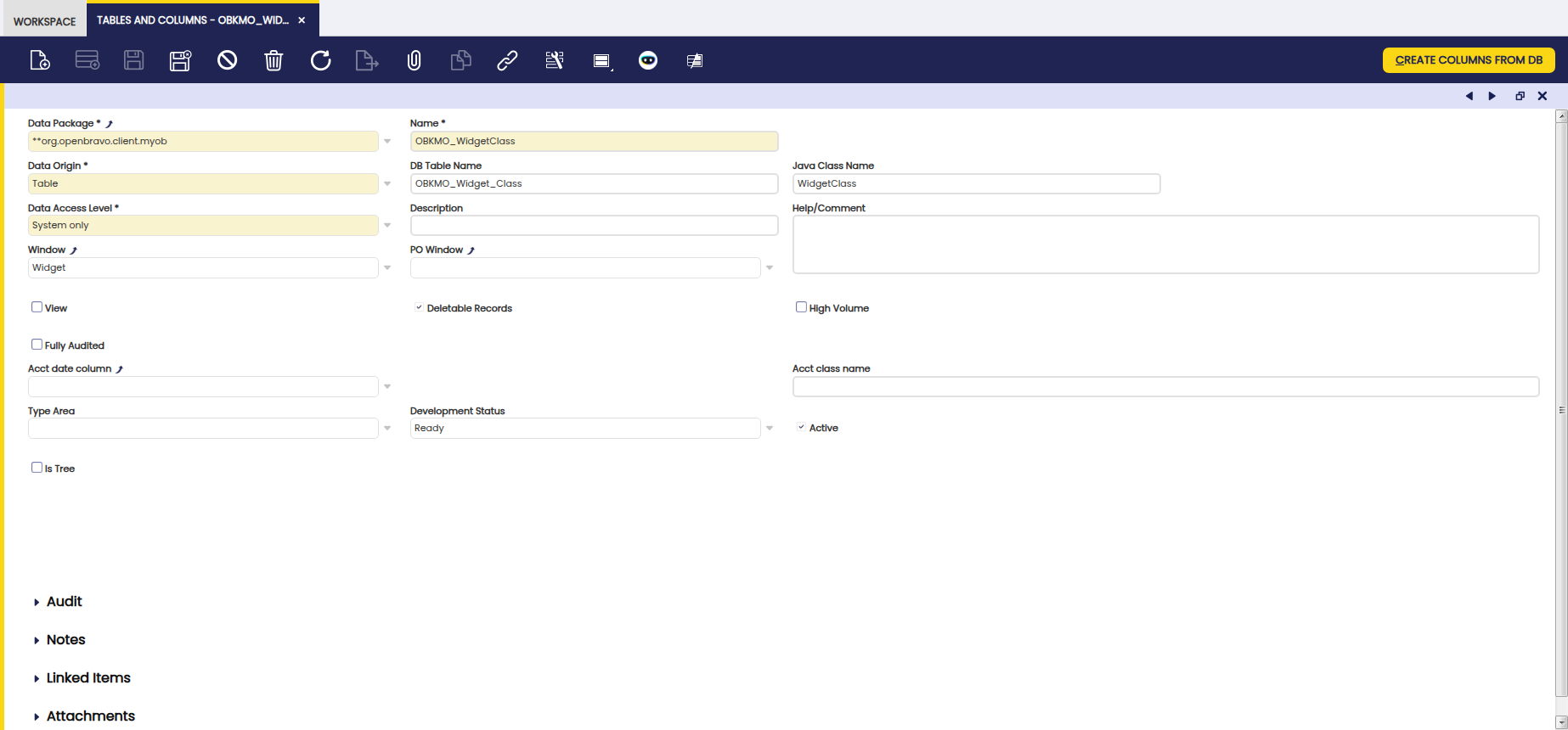 If your Module includes a table in the Application Dictionary then you need to register one (or many) data packages in your Module. For a full description on how packages are used, visit the DAL developers manual. For each package you have to set the next properties: