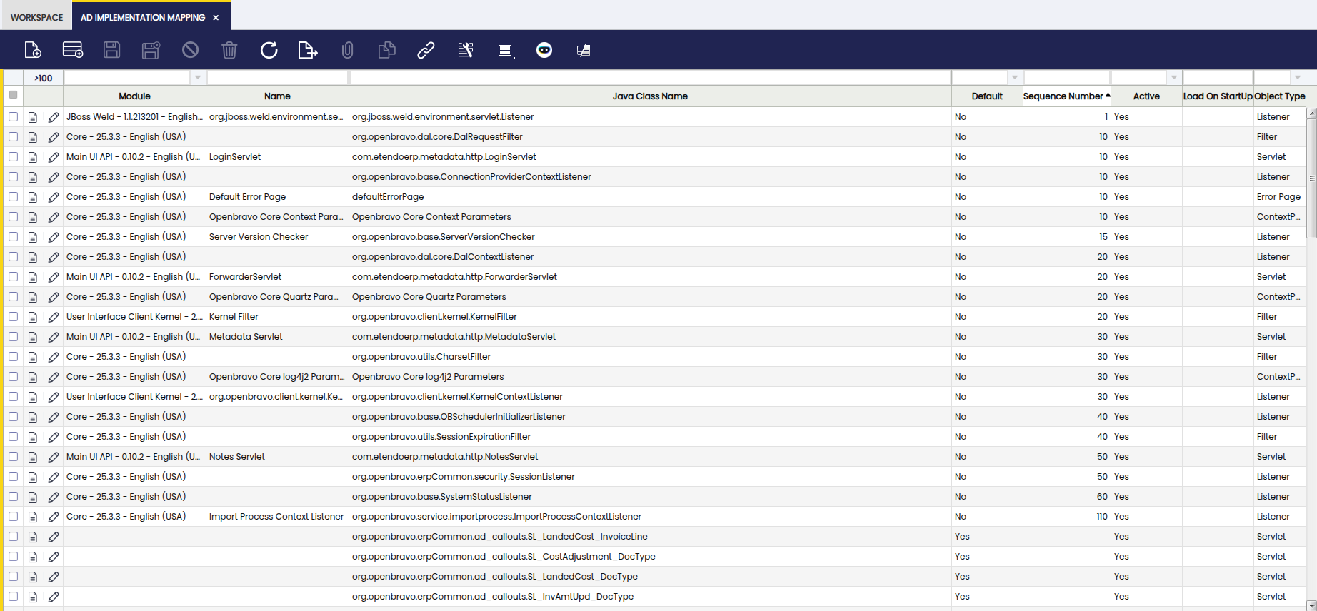 There is a few number of exceptions to this description: some servlets that are deployed in Etendo context but are not linked to any AD component, such as the DataGrid or the AuditInfo servlets. They are invoked from manual or standard components (windows, forms, etc.) through http requests by hardcoding its url-mapping in the request. It can be interpreted still as a mapping of actual classes that implement a functionality that is not described in current Etendo model, although it may be in the future.