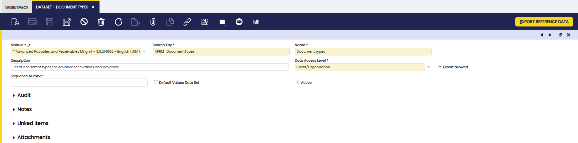 - Organization : it will be imported at Organization level during "Initial Organization Setup" or "Enterprise module management" processes. Only tables with Client/Organization, Organization and All data access level are allowed in Organization data sets (eg. Business partners, Sales orders, etc.)