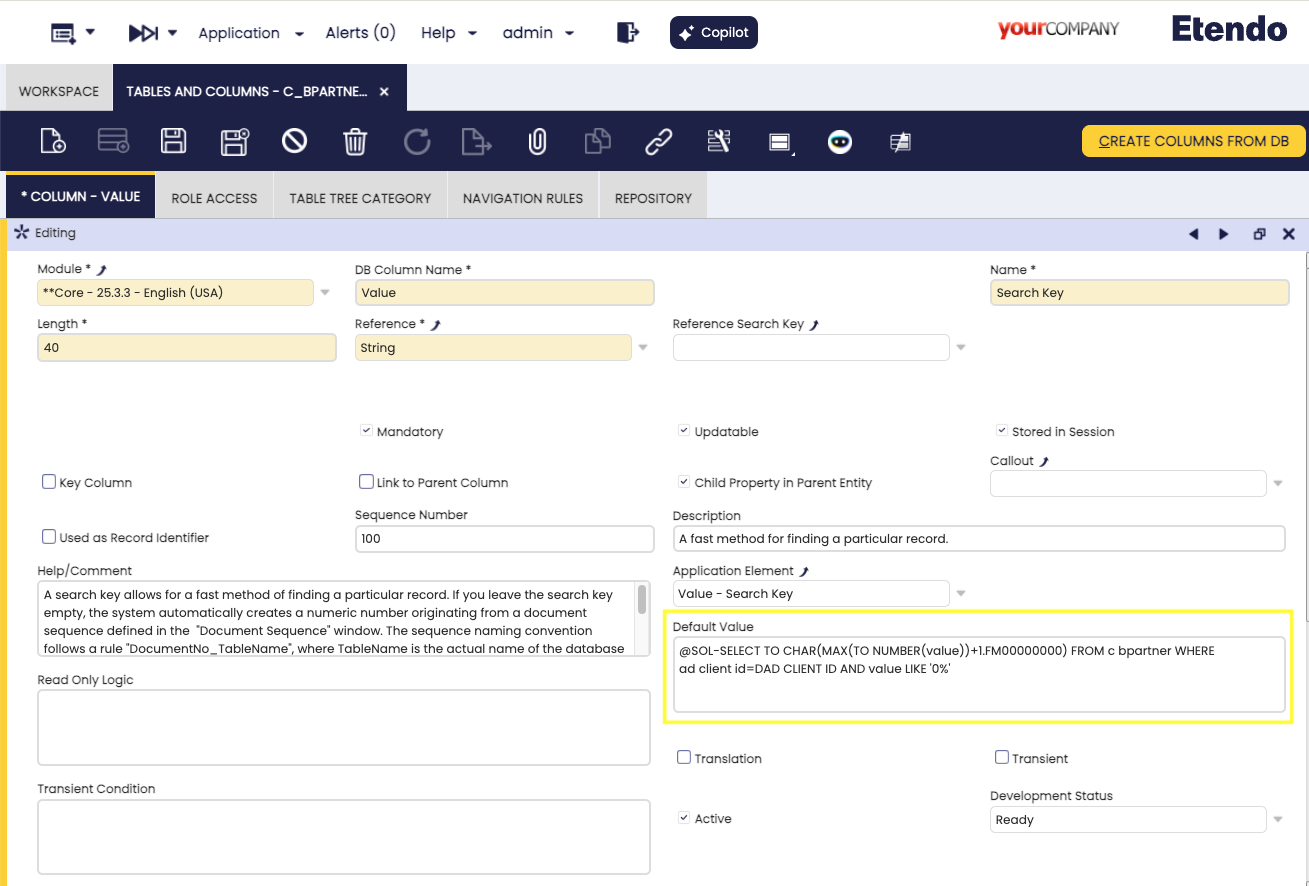 @SQLmeans that this default is not going to be interpreted as a constant but as a SQL statement to be executed and the default is the result of that statement.- The select statement selects the maximum previous value of the search key for business partners in this same client and increments it by one.