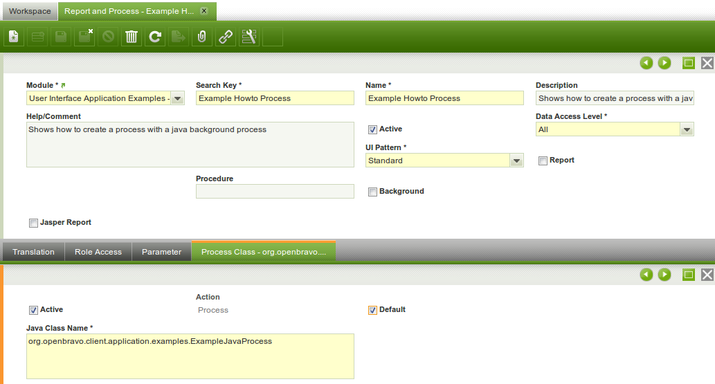 - Enter a new record in Report and Process, defining the pattern, the java class (step 1) and the parameters.
