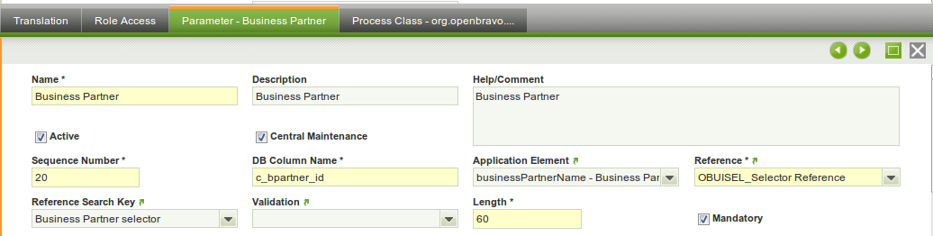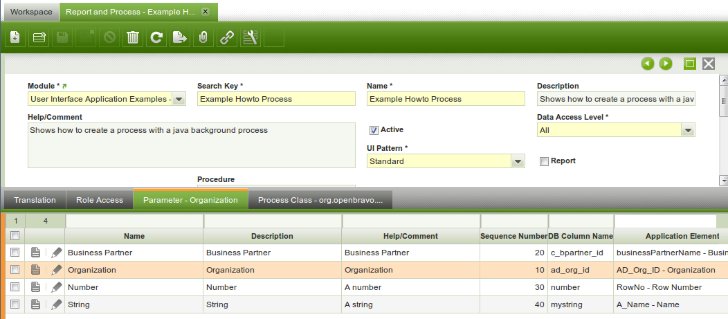 Now the parameters of the process need to be defined. Or more exactly their type and visualization. This is done through the Parameter child tab of the process. The example has three parameters: business partner, organization and a string. The images below visualize their settings: