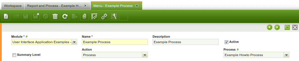 The first step is to create a process record, go to Application Dictionary > Report and Process. Create a new process record as shown in the example below.