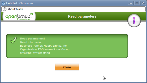 This method receives a ProcessBundle, this bundle contains all the parameters for the process. When the process finishes it must add a result to this bundle, this result is an OBError instance that will be shown in the pop-up.