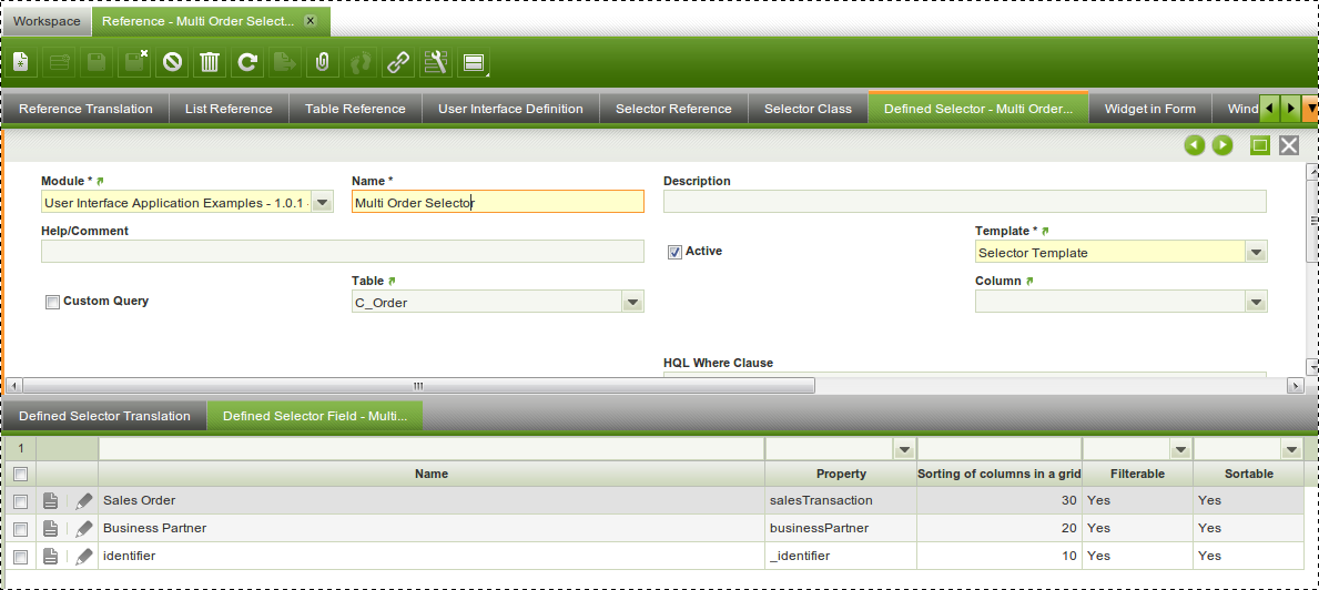 OBUISEL_MultiSelector Reference - In Defined Selector tab, set the properties for the selector: