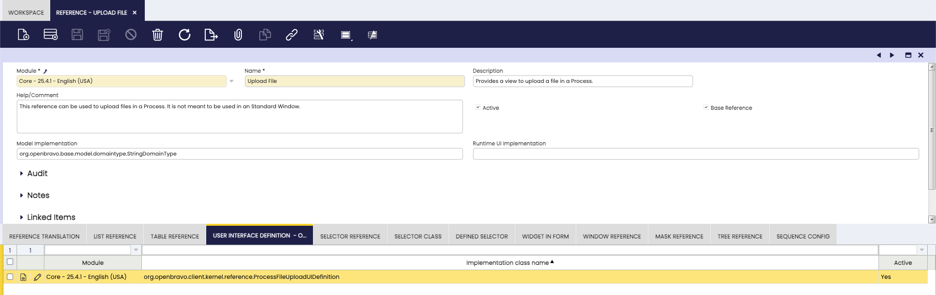 The Upload File reference is already provided by the Etendo core and does not need to be created or extended by the developer.