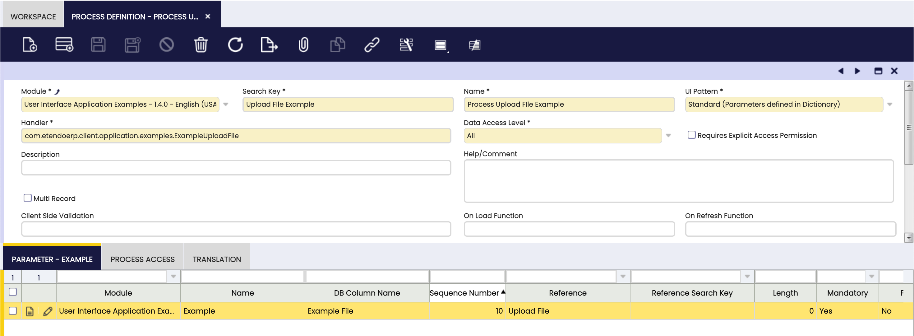 com.etendoerp.client.application.examples.ExampleUploadFileJava class that implements the process logic and extendsBaseProcessActionHandler. - UI Pattern: Standard (Parameters defined in Dictionary)