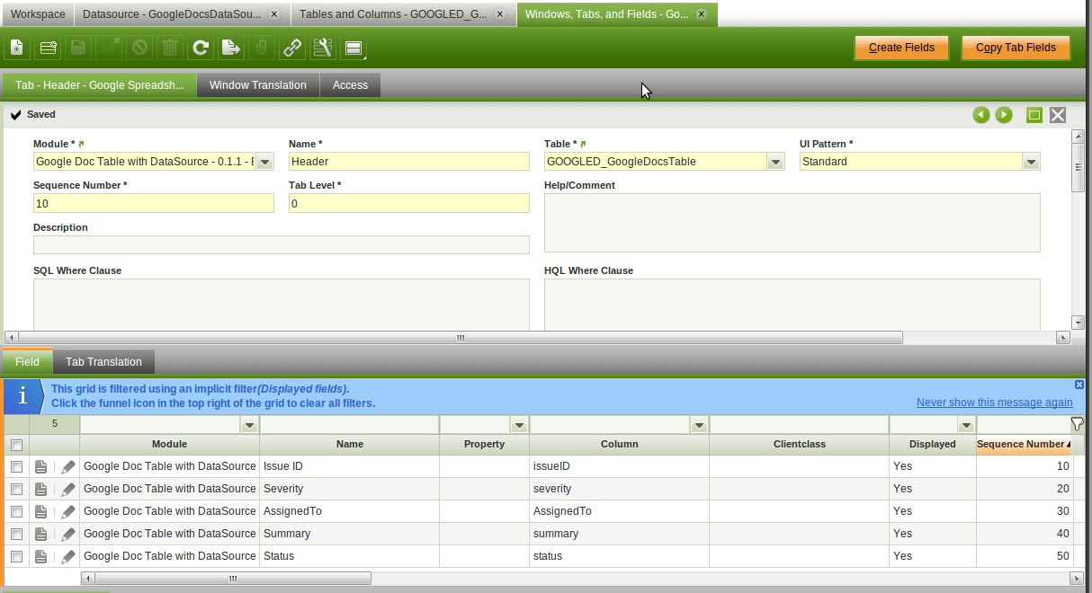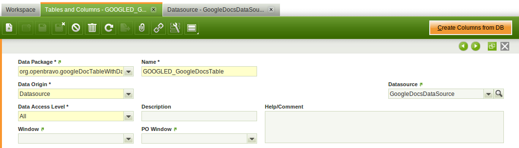 Once the table its columns have been defined, it is the Window's turn. Windows with tabs associated with datasource based tables are defined in the exact same way as with tabs associated with database table based tables. This section describes how to do it.