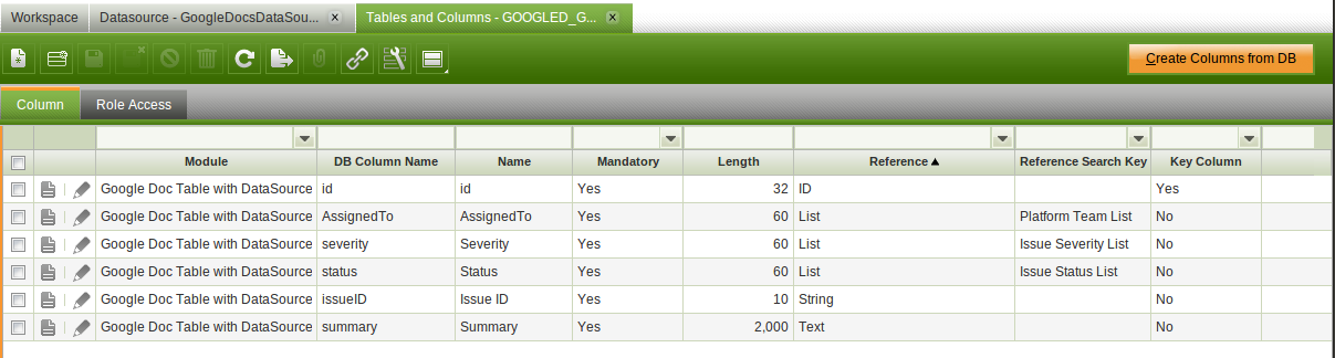 It is not possible to use the Create Columns from DB to define the columns of datasource based tables, so they will have to be added manually.