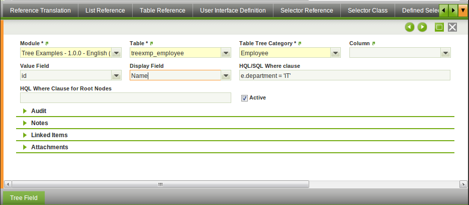 - HQL Where Clause for Root Nodes: this where clause is used to specify what are the root nodes for this tree. If it is not set, then the root nodes will be those who have parentId = null or parentId = '0'.