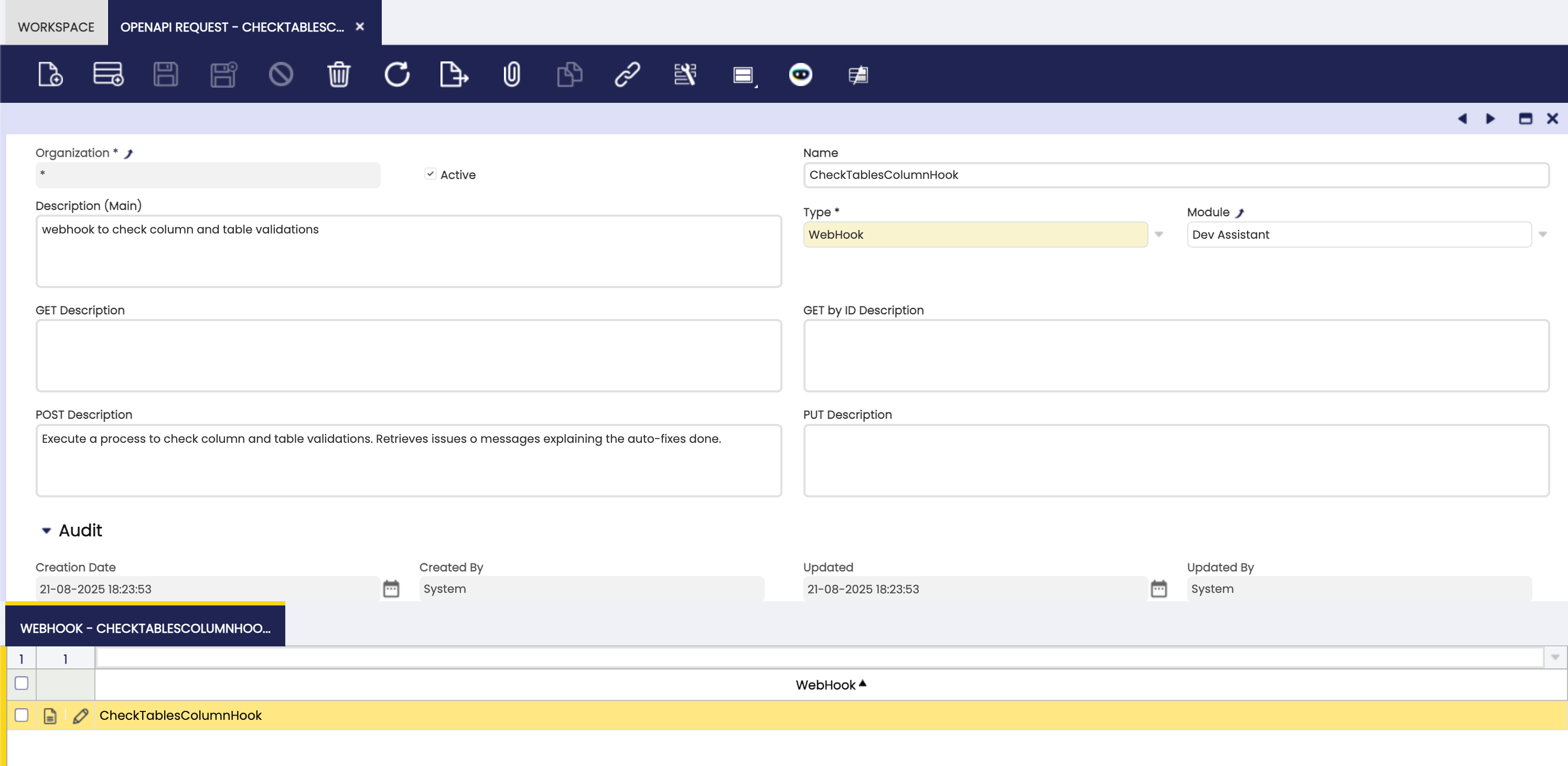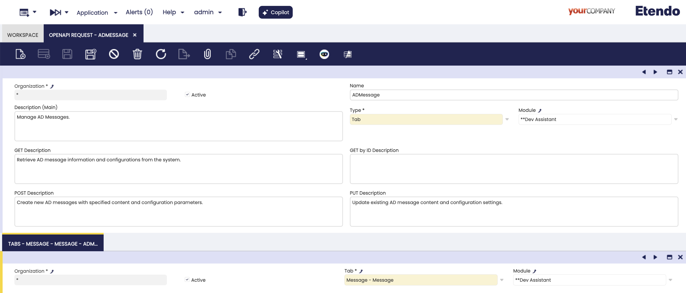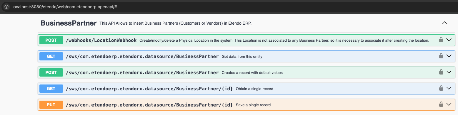 operations, but you can simplify it by specifying only the required fields in the Fields sub-tab of the OpenAPI Request window. - Since Tab-type endpoints reuse the same business logic as Etendo Tabs, they behave consistently. For example, you can create a Sales Order header by providing only the Business Partner ID, and the system will apply the same logic as when creating it through the ERP UI.