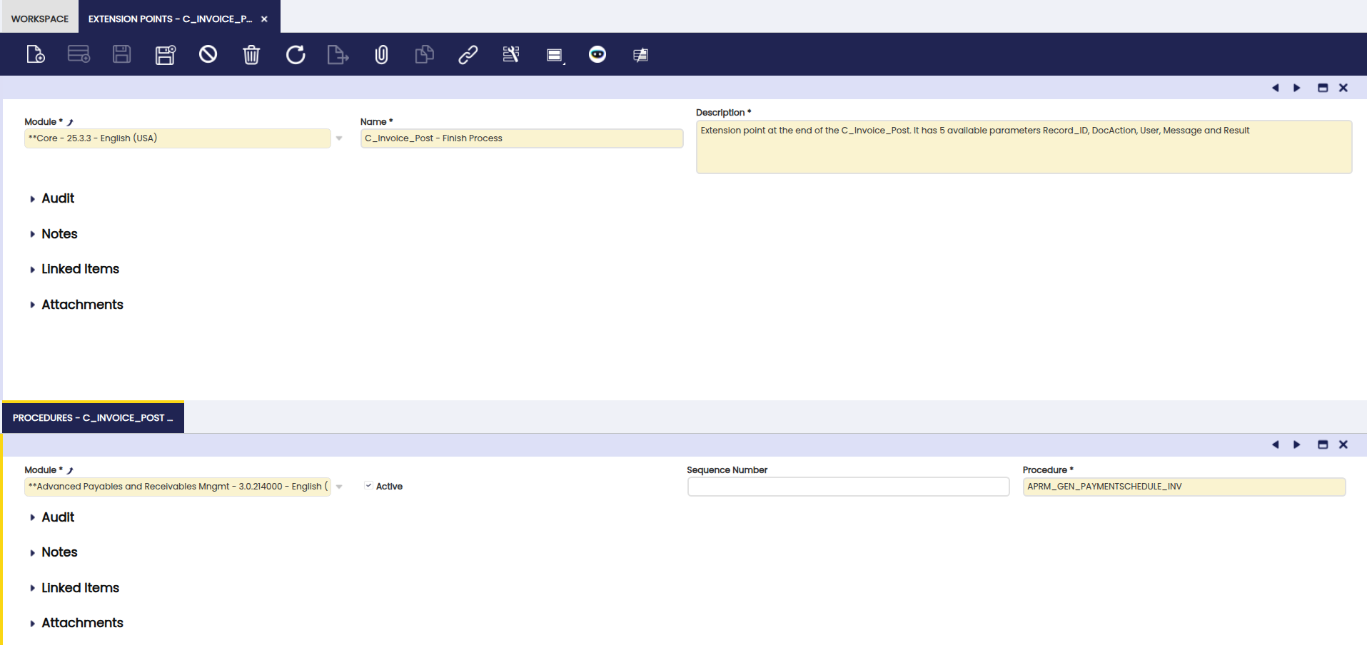 Finally define the PL/SQL procedure with the same name defined in the field Procedure and with only one character varying parameter that will reference the AD_EP_INSTANCE record that contains all the parameter values used to invoke the PL/SQL procedure. For example all the PL/SQL procedures attached to the Extension Point C_Invoice_Post - Finish Process are