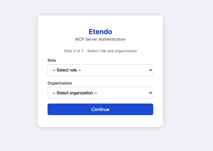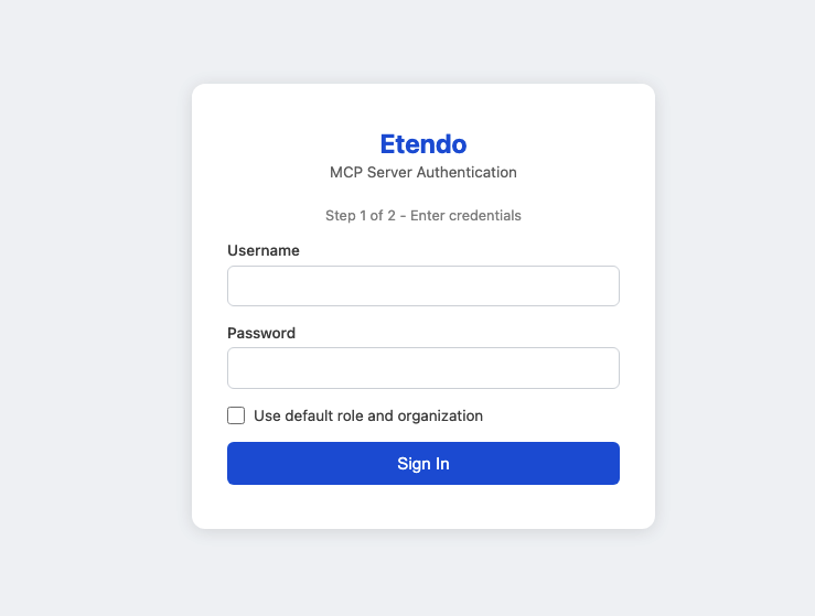 Cuando OAuth está habilitado, el servidor MCP también expone los endpoints de descubrimiento y autorización OAuth requeridos por clientes MCP compatibles. Los usuarios se autentican a través de una página de inicio de sesión de Etendo, y el cliente recibe automáticamente el resultado de la autorización.