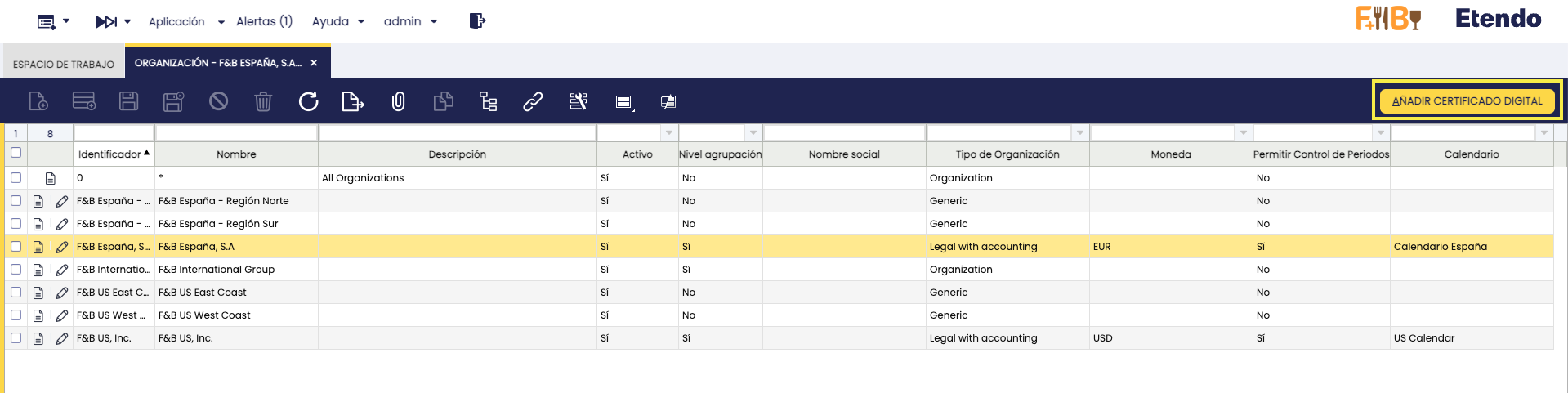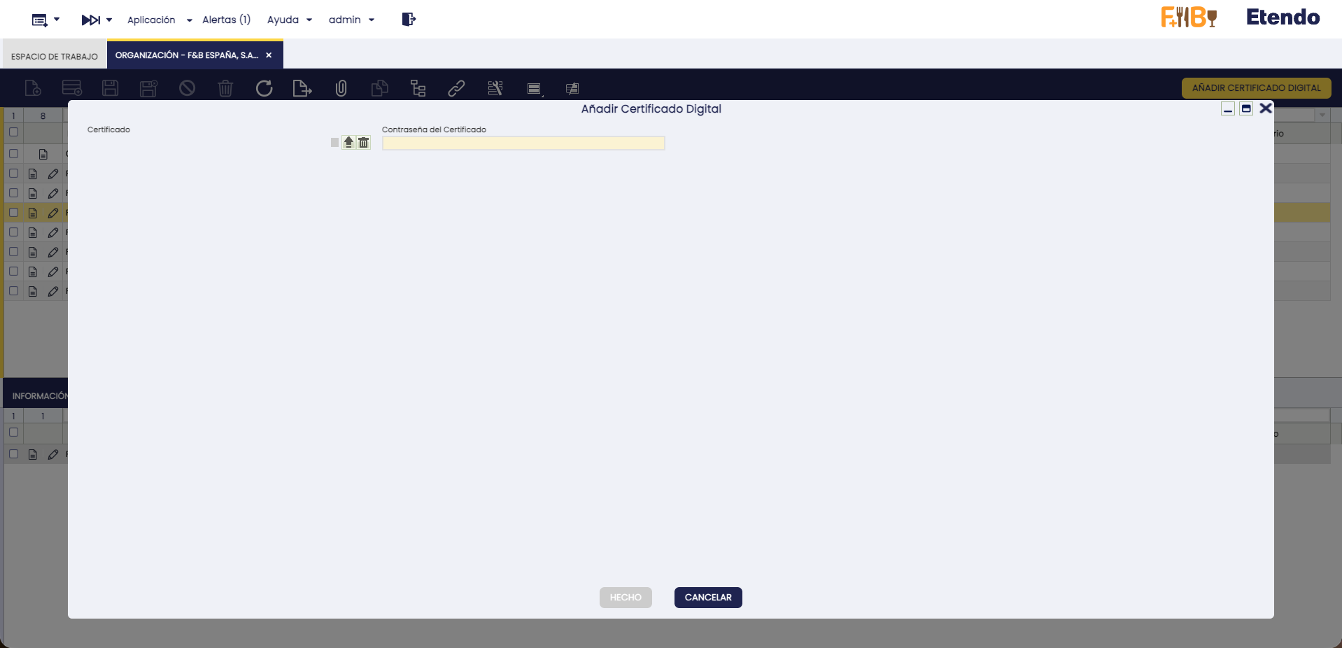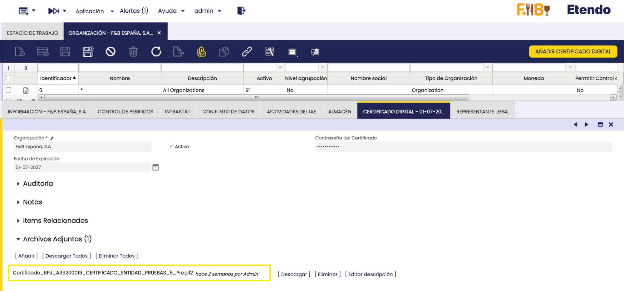 Se ha añadido a la ventana Organización el proceso Añadir Certificado Digital, el cual solo puede ejecutarse para organizaciones legales. El certificado se utiliza en procesos como la firma digital de documentos y el envío de facturas electrónicas.
