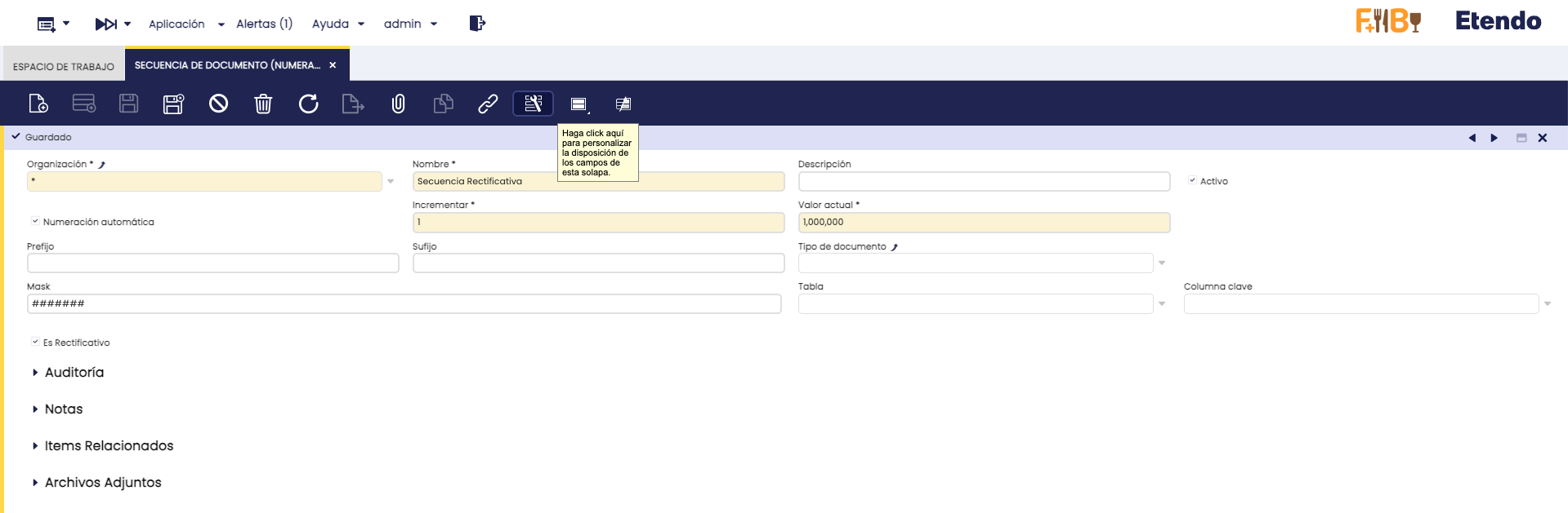 - Secuencia de Documento (Numeración): Crear un nuevo registro y marcar la casilla Es Rectificativo. Esto permite que el sistema la reconozca como una secuencia rectificativa.