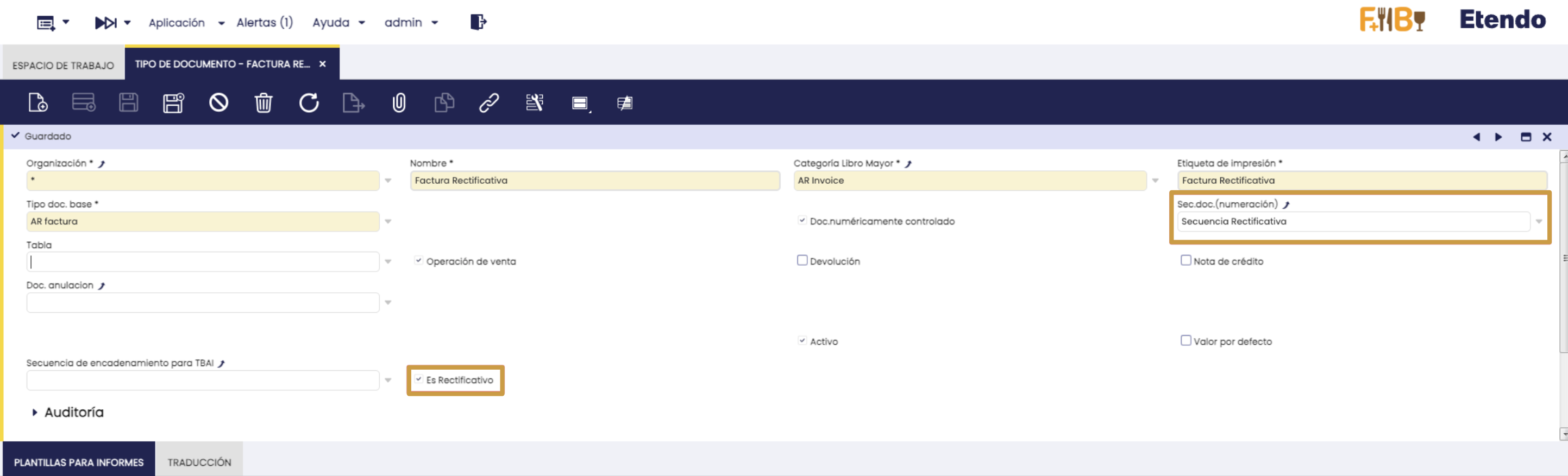 - Tipo de Documento: Crear un nuevo registro y marcar la casilla Es Rectificativo. Asociar la secuencia creada en el paso anterior en el campo Sec.doc.(numeración) si es no transaccional. En el selector solo aparecerán secuencias marcadas como rectificativas cuando el tipo de documento se ha configurado como rectificativo.