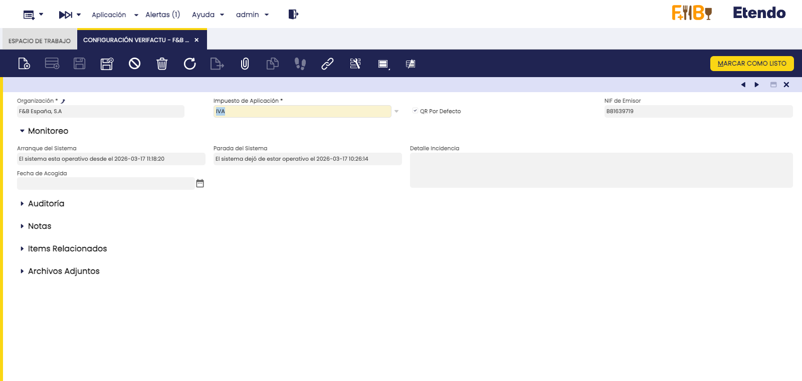 Al pulsar Marcar como Listo, el sistema asigna automáticamente la Fecha de Acogida a Verifactu con la fecha actual. A partir de esa fecha, el proceso de envío automático toma en cuenta únicamente las facturas emitidas desde ese momento para su envío a la Agencia Tributaria.