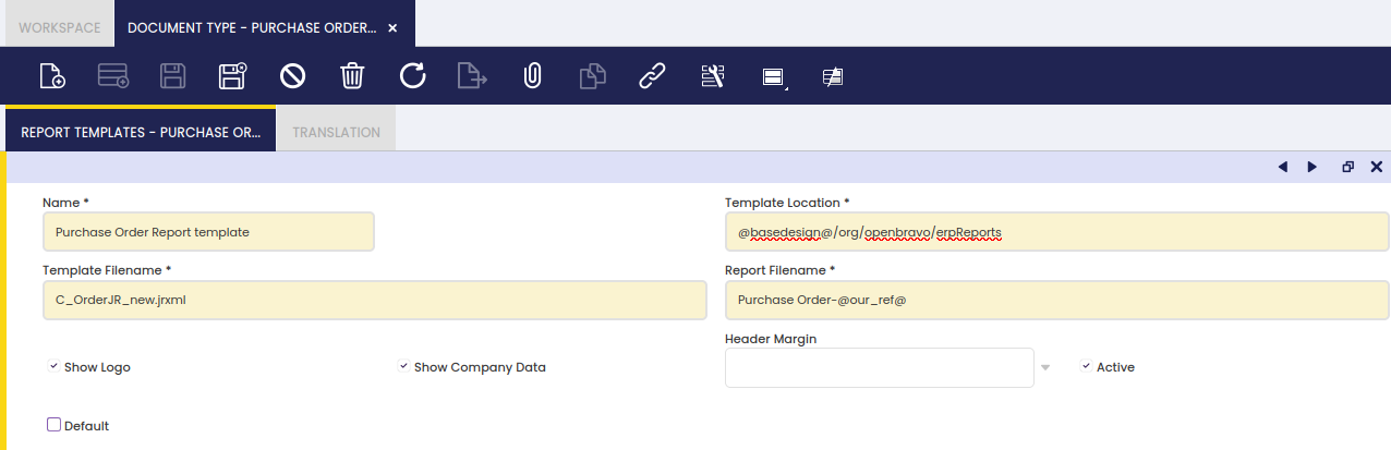 The Report Templates tab allows the user to configure a different aspect for the printables related to each document type by setting up Jasper .jrxml templates.