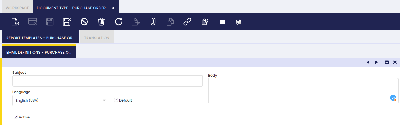 The Email Definitions tab supports the creation of as many email templates as required, depending on the language to be used for sending the documents by email. Documents can be sent by email by using the action button Email which can be found in the corresponding toolbar.