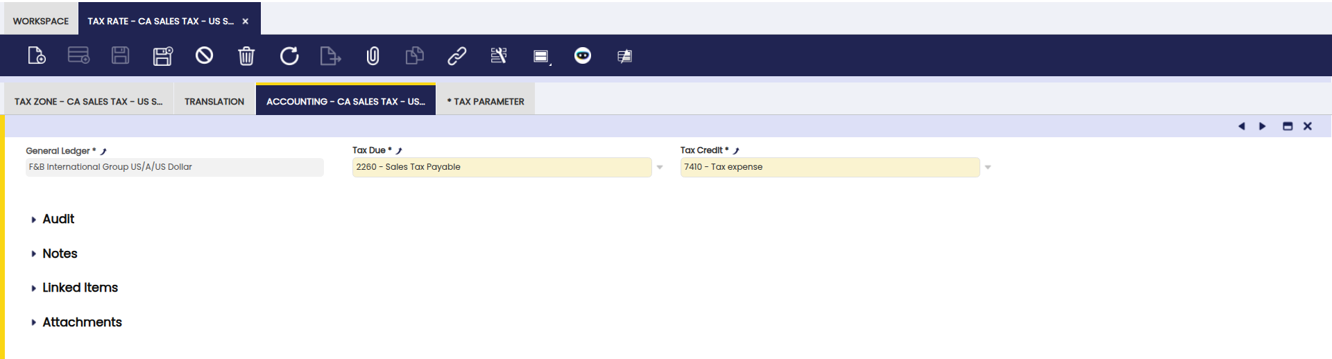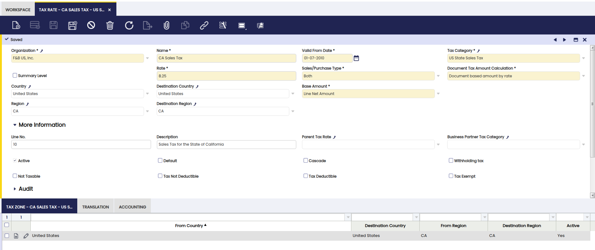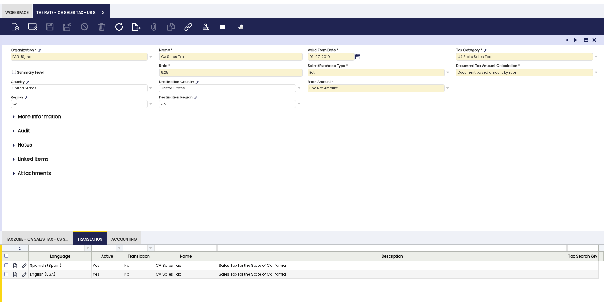 Country/Region and Destination Country/Region: Taxes such as VAT and US Sales Tax take into account where a transaction originates and where it is destined in order to determine whether the tax applies. These two fields allow to enter that information by taking into account if the tax is a purchase or a sales tax type, therefore when issuing a sales invoice from F&B US Inc (USA Country and New York Region) to a customer also located in Destination Country USA and Destination Region New York, only the sales tax rates created within that specified Tax Zone would be applied.