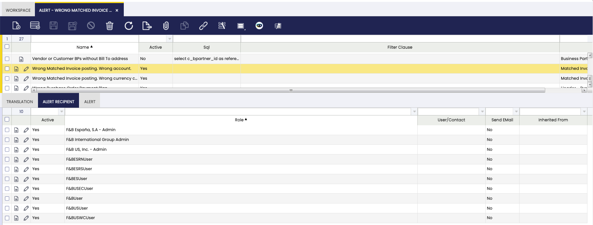 For instance, Products without a defined price, Products under stock or Bank account without accounting information - An alert rule can be applied to every Etendo user or just to a set of them. Alert recipients are the Etendo users for which a given event is going to be monitored.