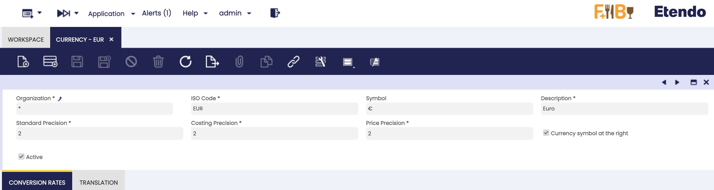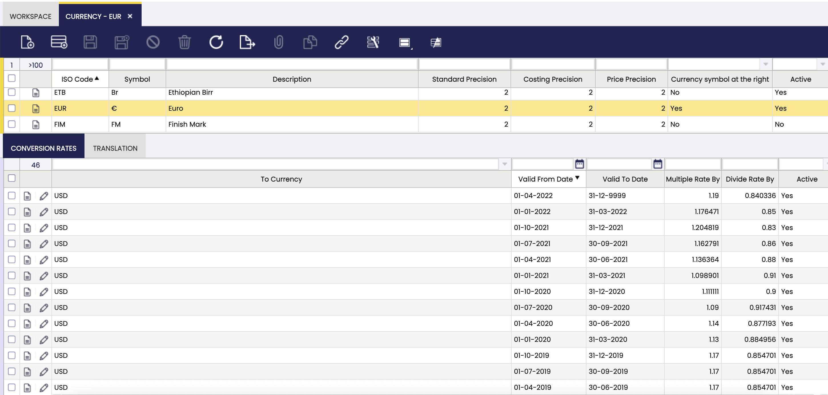- Etendo recommends conversion rates to be configured in the Conversion Rates window, as it is required to defined both the Multiple Rate By (USD - €) and the Divide Rate By (€ - USD) to properly defined the exchange of two currencies.