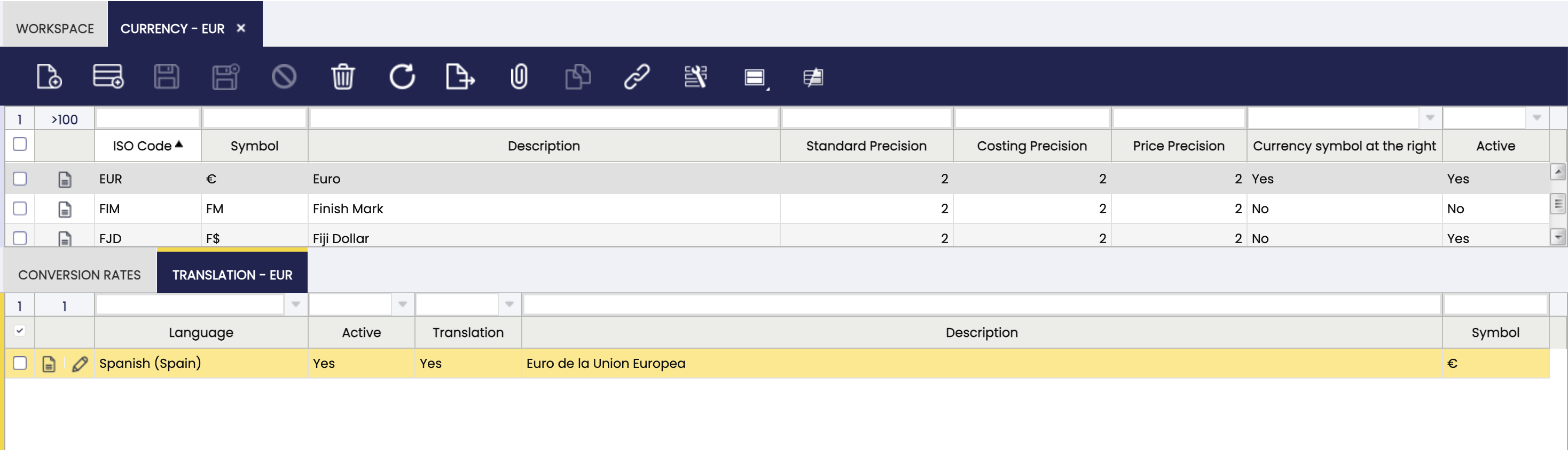 Currency window allows the user to visualize or to create and configure the currencies to use in monetary transactions.