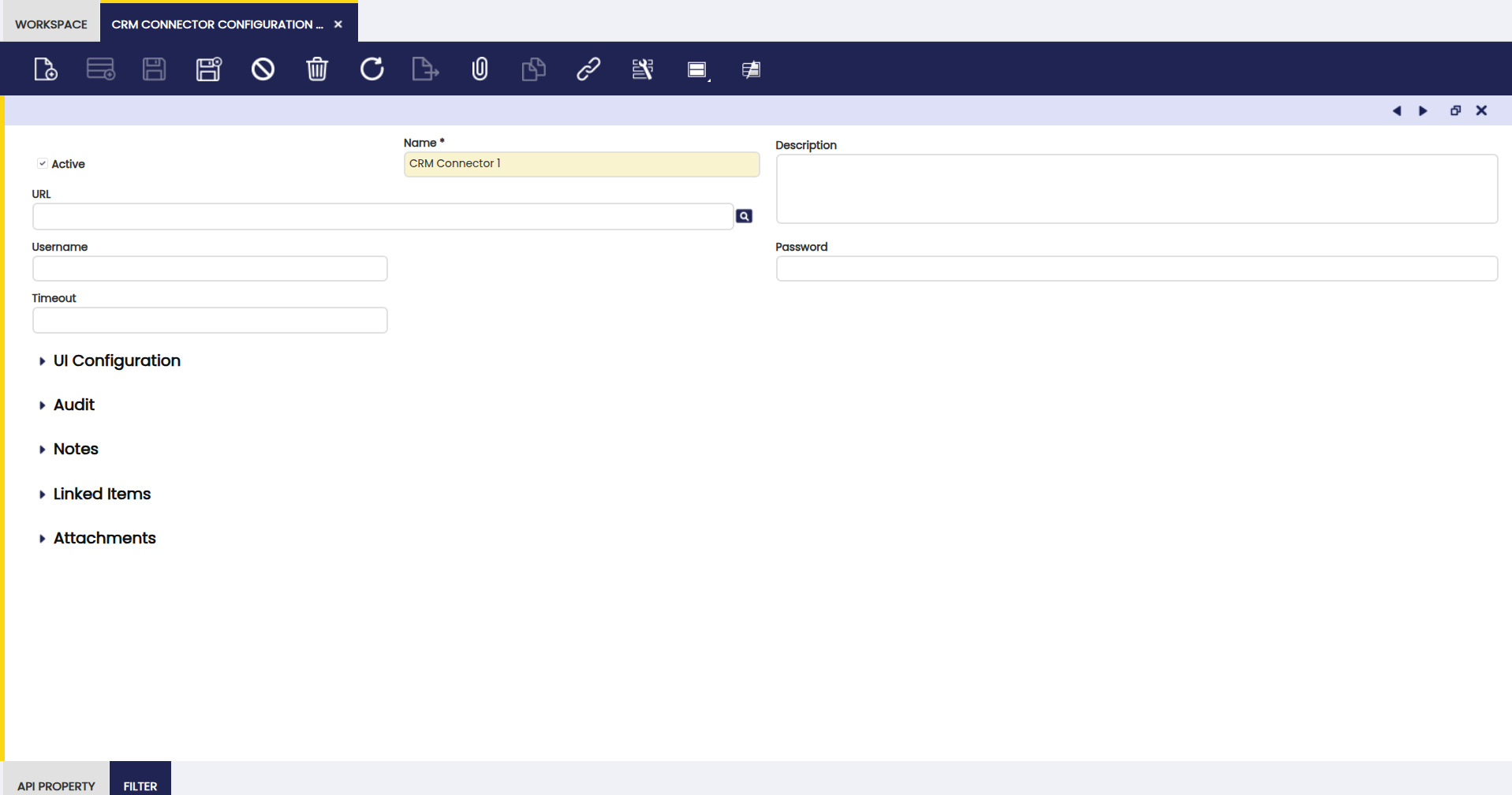 The concrete CRM connector must add a configuration in this window to enable it to connect to the external system and to define the properties and filters used by Etendo to map with the external system information.