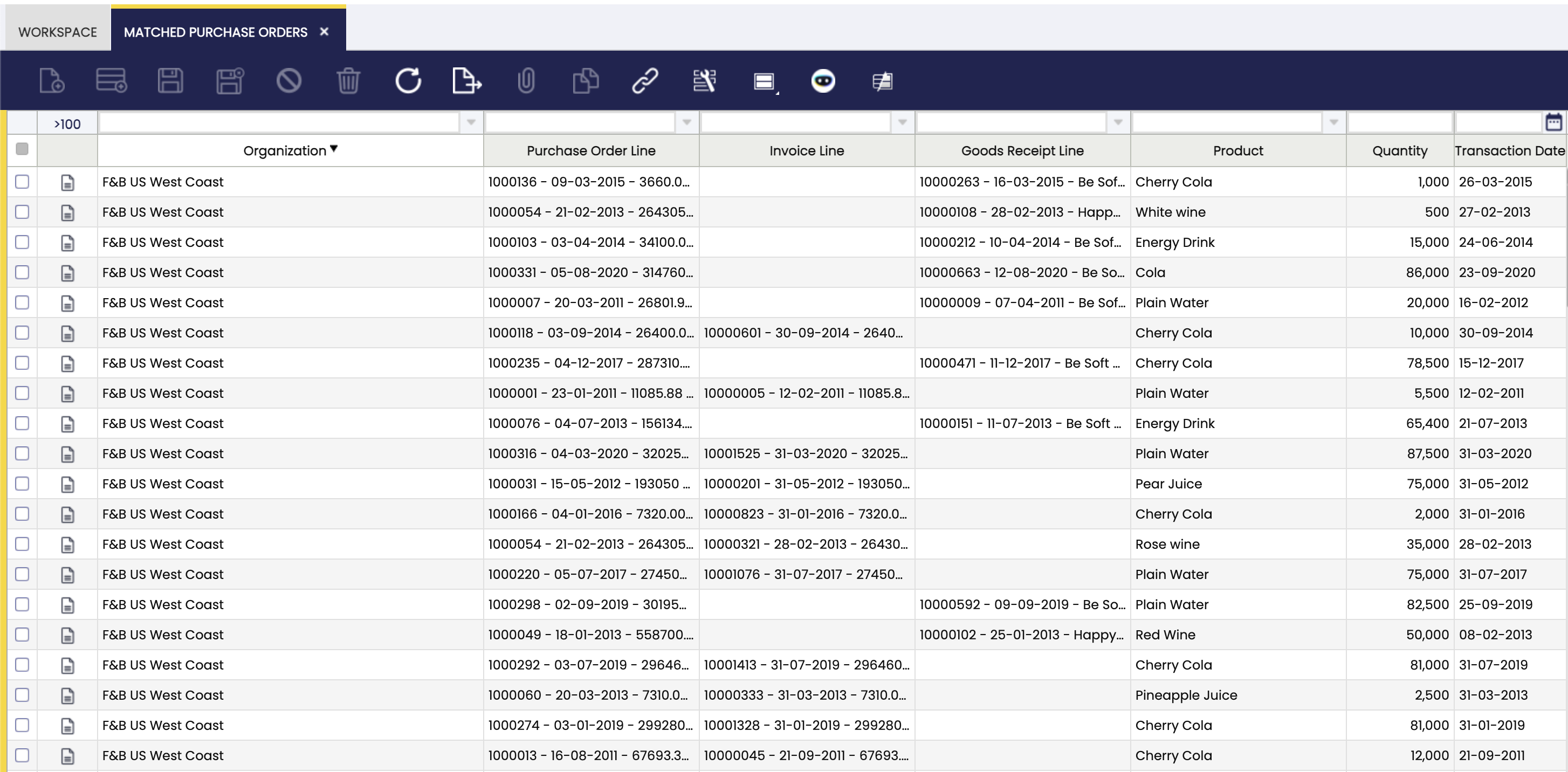 This window informs about the matching between each purchase order, goods receipt and invoice line.