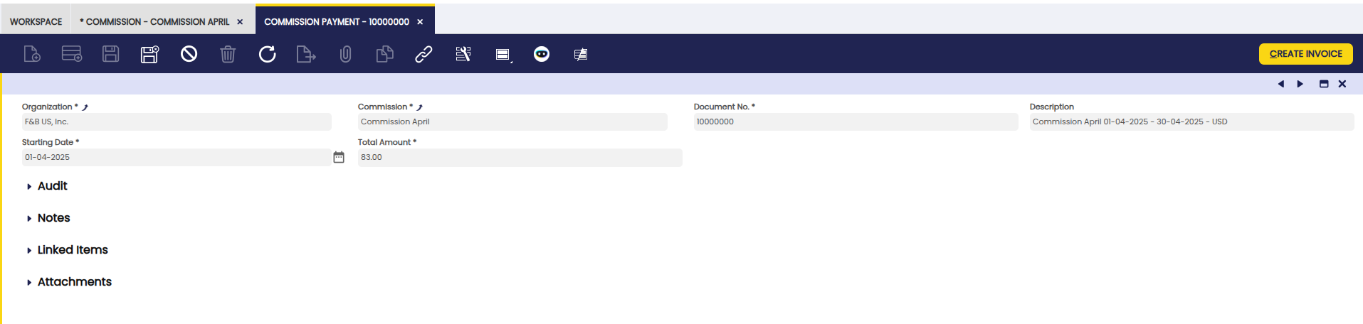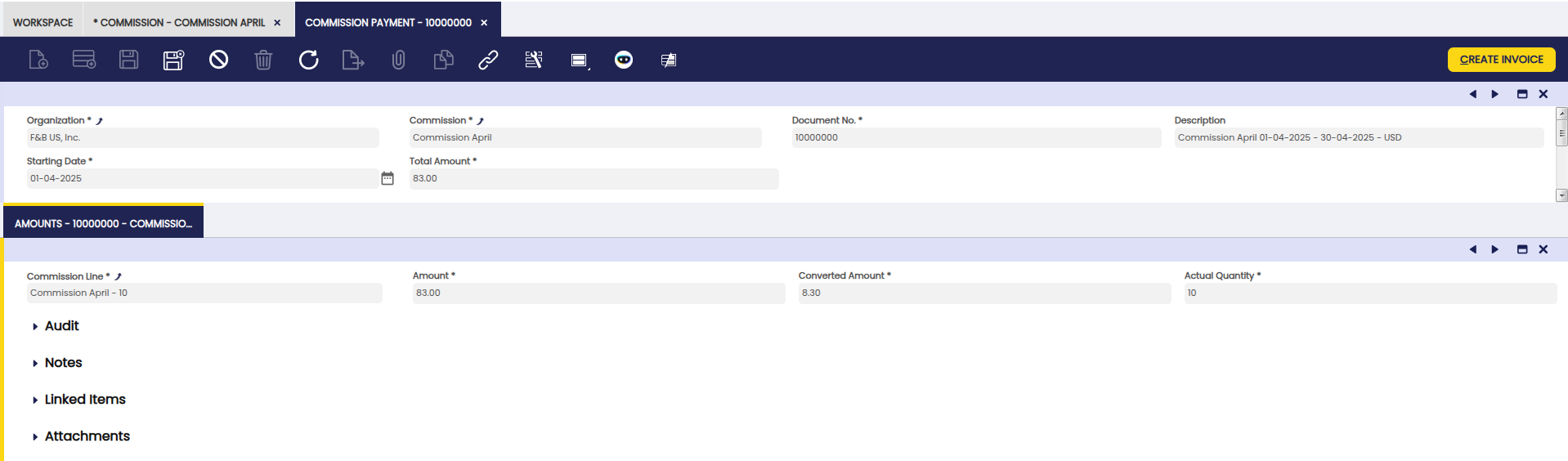 In this section, the user can create commissions and create corresponding invoices.