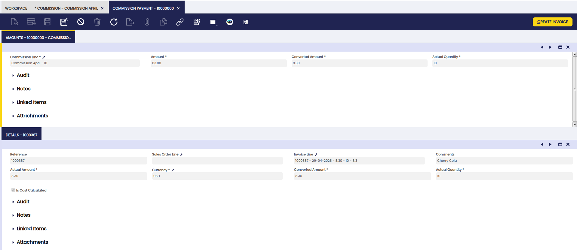 - The header shows the commission document, the starting date and total net amount. In case an invoice is created then both documents are linked to each other later on.
