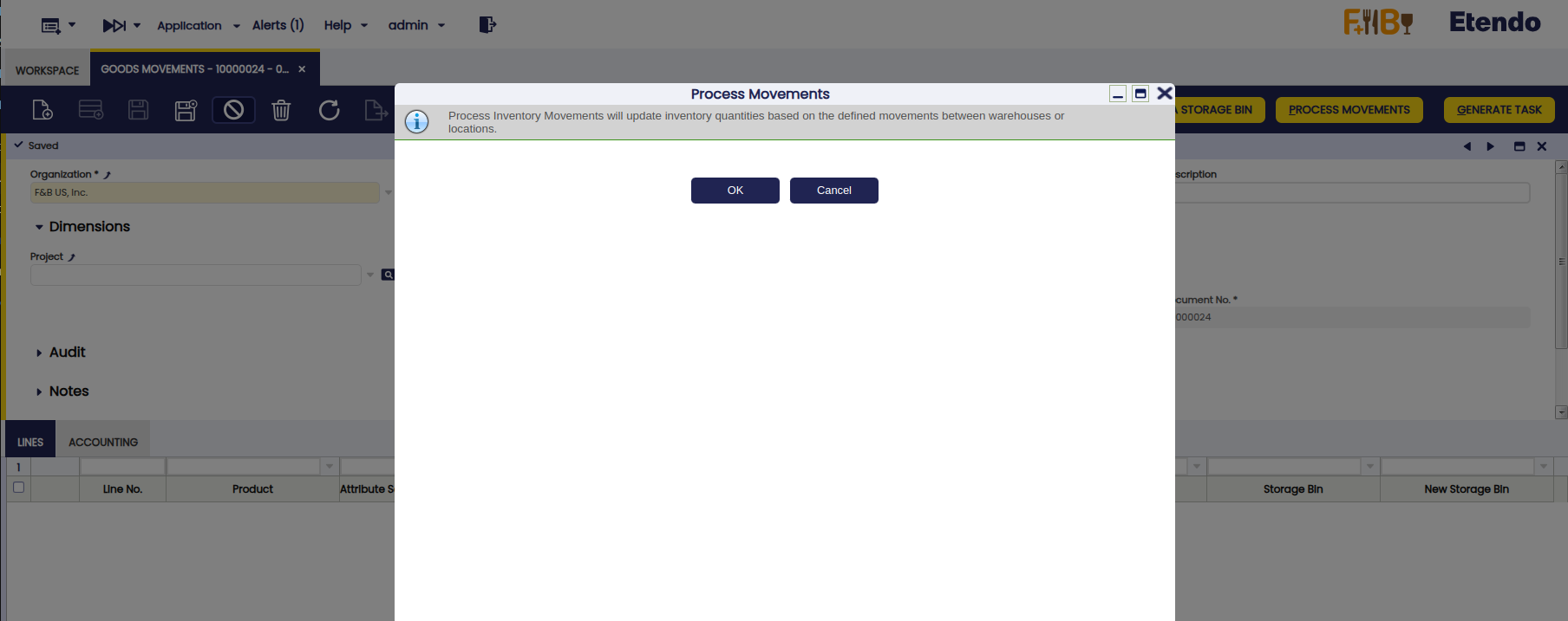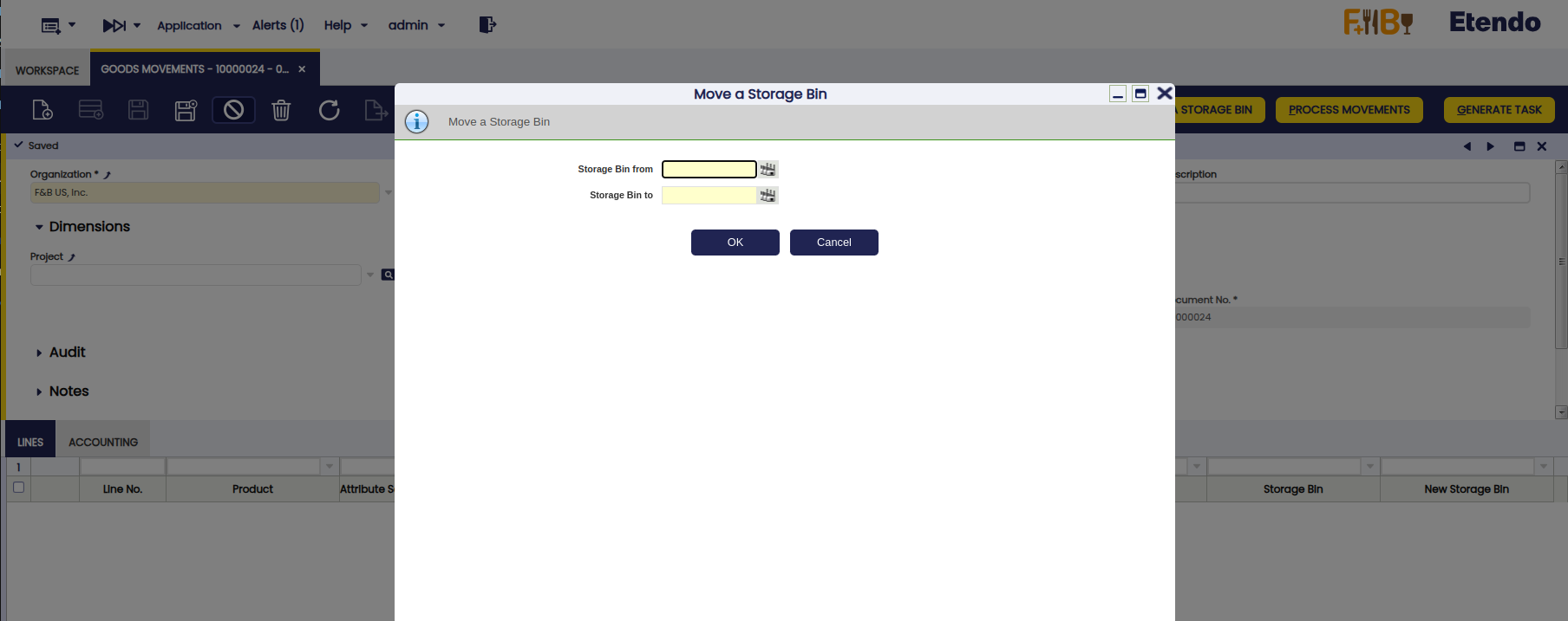 Goods Movement window allows the user to make internal inventory movements among warehouses and storage bins.