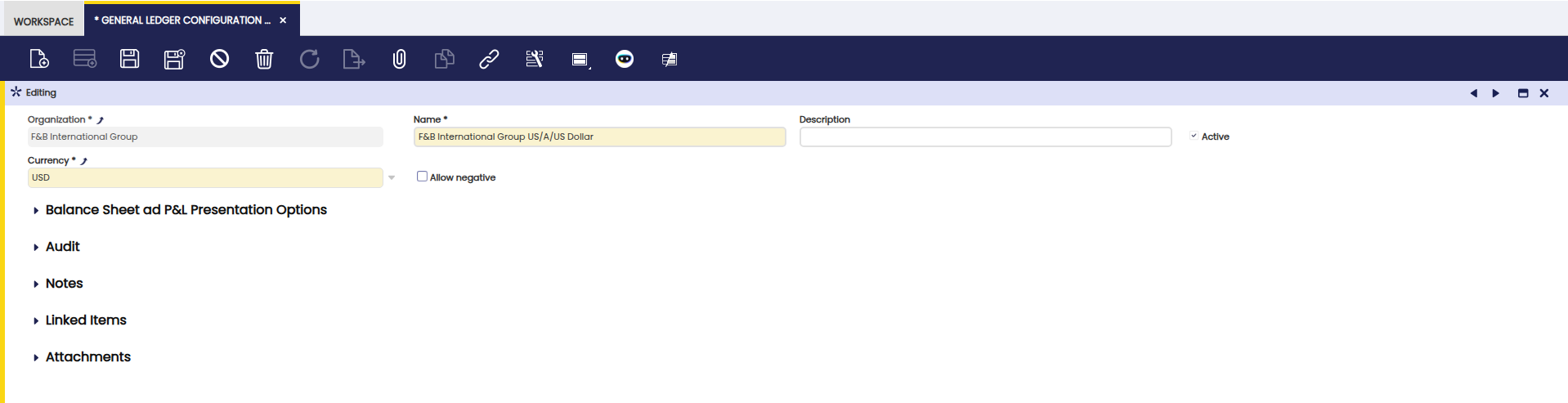 - Entering the Name of the General Ledger configuration, for instance EUR General Ledger.