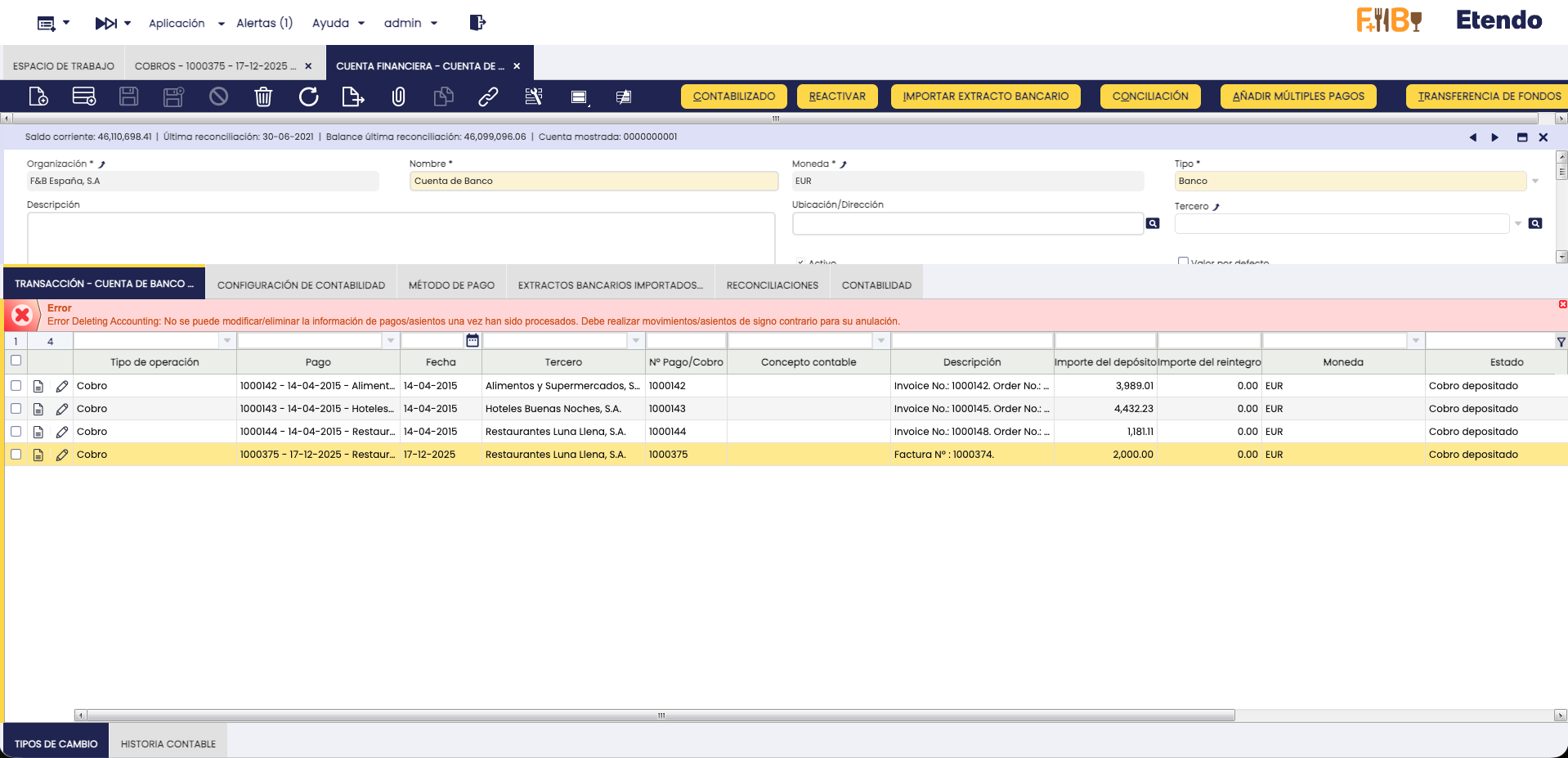 Se prohíbe la modificación/eliminación de cobros, asientos y/o transacciones de la cuenta financiera que ya hayan sido procesados y/o contabilizados.