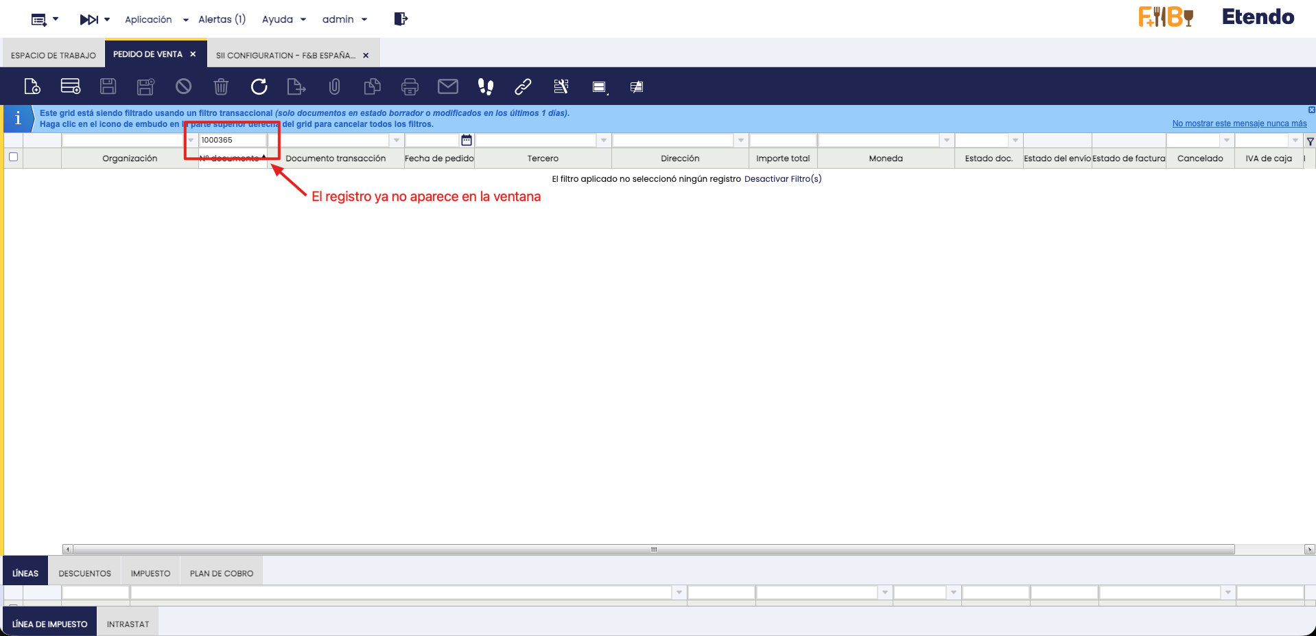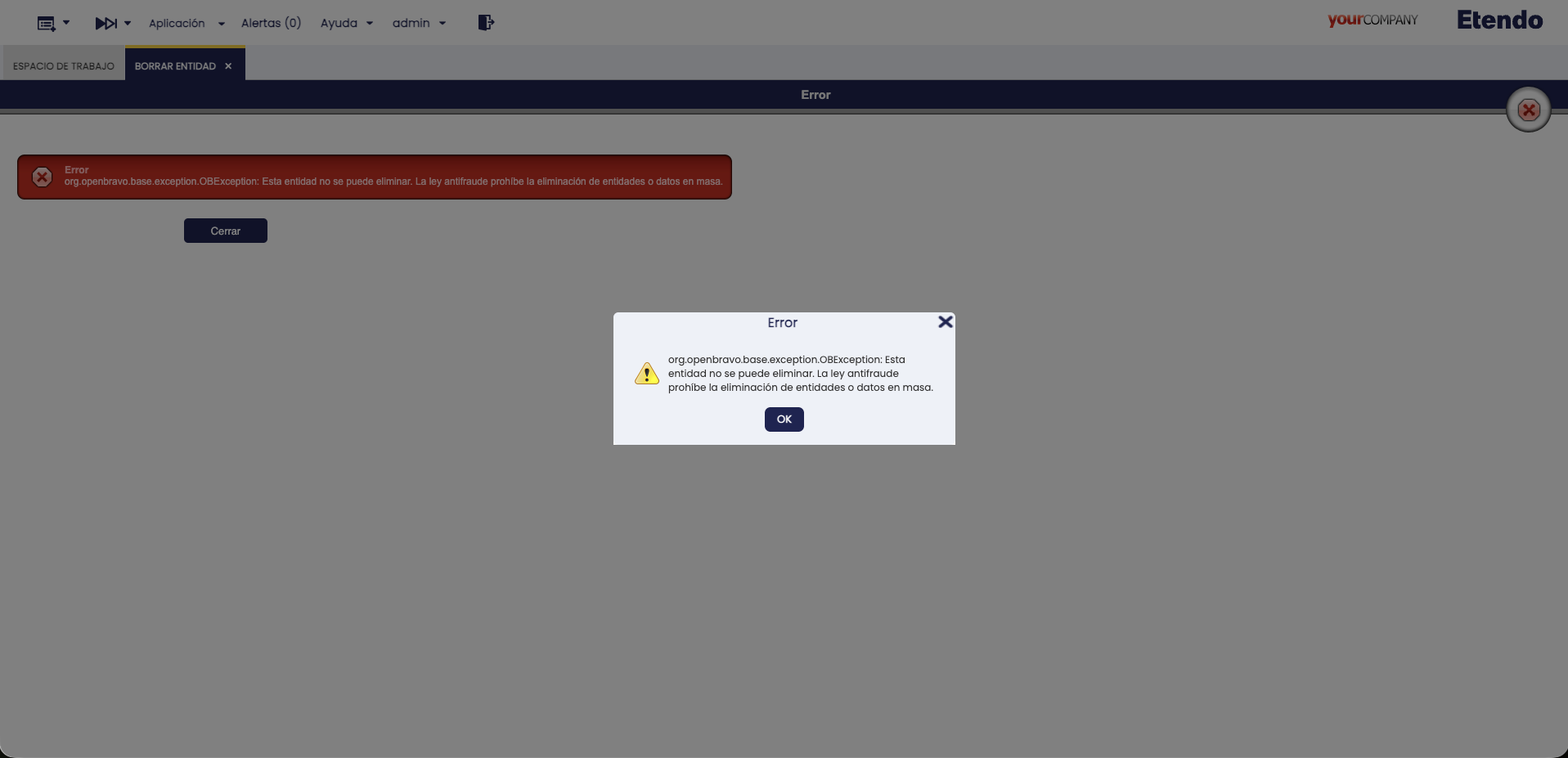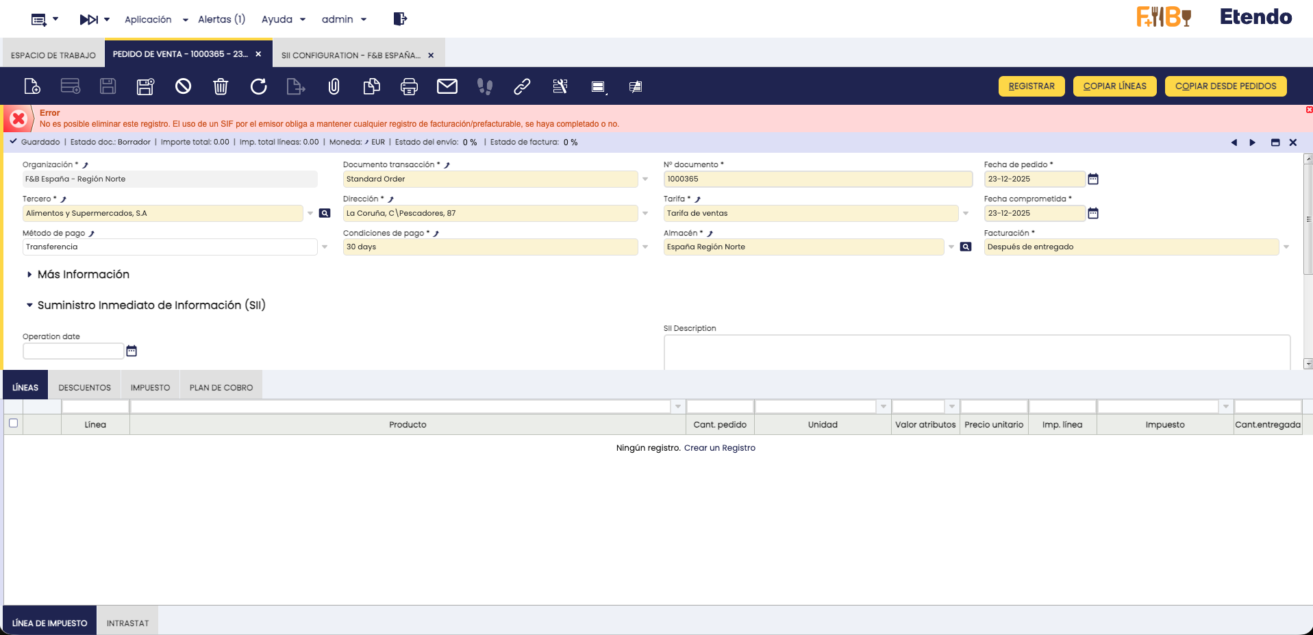 Con la instalación del módulo de Antifraude, si un emisor (Organización legal) utiliza un SIF de cualquier tipo (SII, Verifactu o TicketBAI) no le será posible eliminar facturas, pedidos o albaranes del flujo de ventas, incluso aunque los mismos se encuentren en estado borrador. Si se intenta hacerlo, se lanzará el siguiente error: