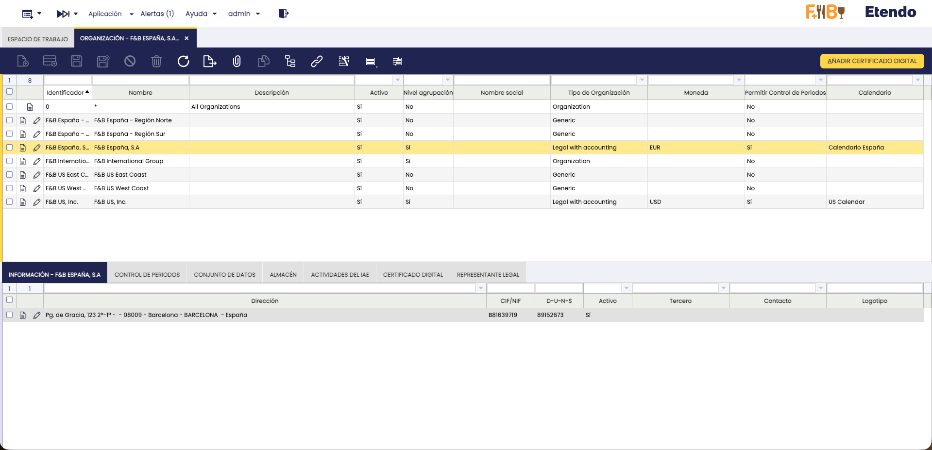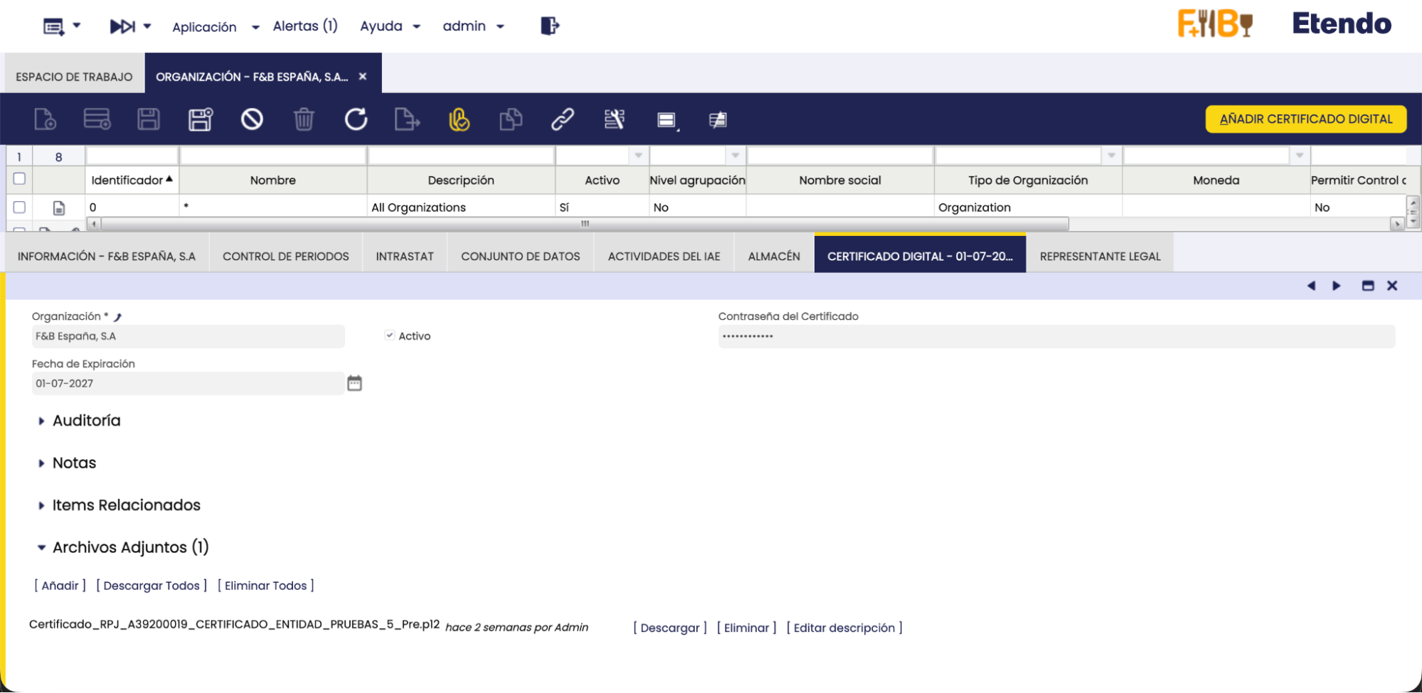 Se ha añadido a la ventana Aplicación > Configuración General > Organización > Organización el proceso “Añadir Certificado Digital”, el cual solo puede ejecutarse para organizaciones legales.