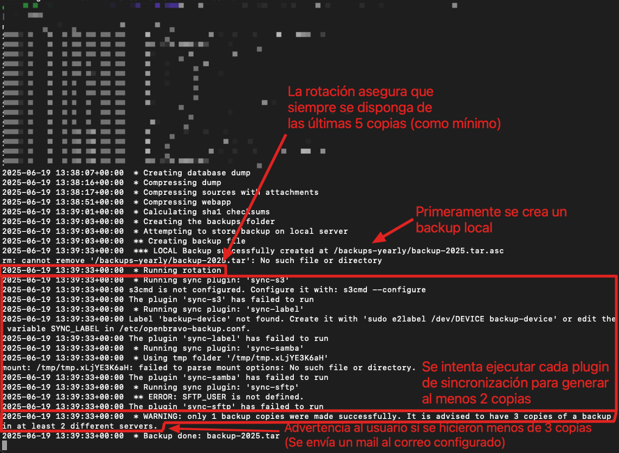 - Finalmente, si el backup local se realizó correctamente, y si la opción está habilitada por el usuario, se hacen copias a servidores externos (utilizando rsync, o scp) y se incrementa el contador si terminaron exitosamente
