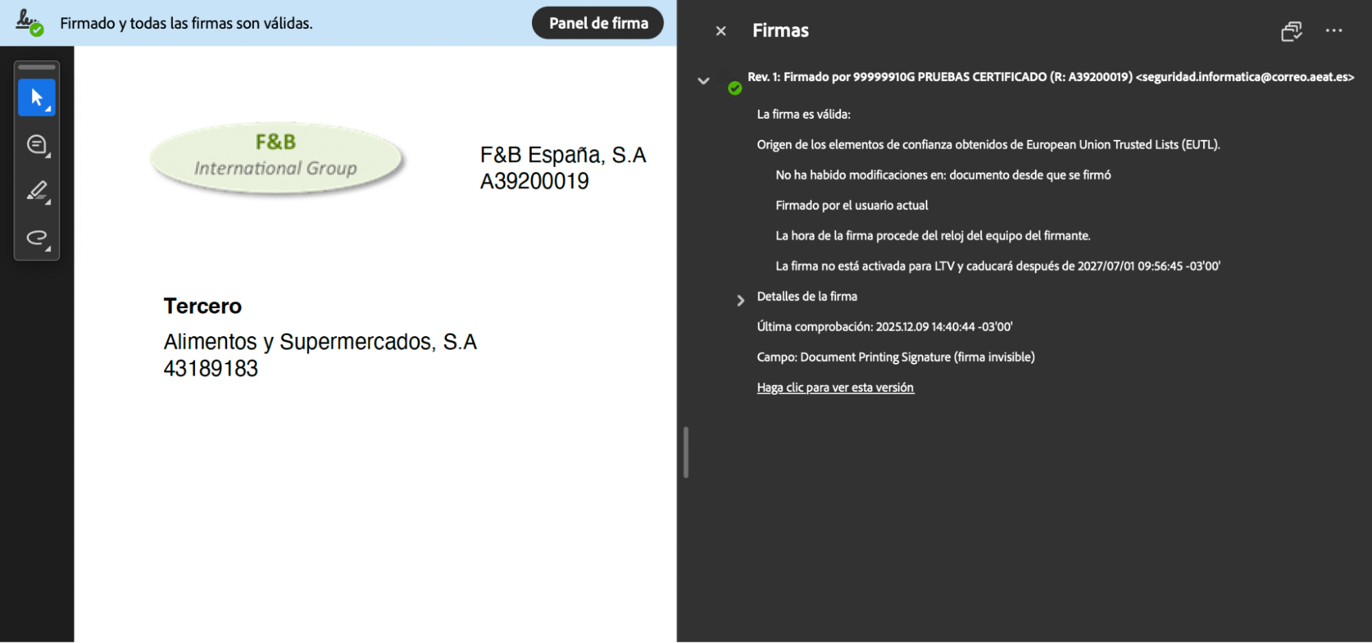 Si todo se cumple, el proceso de impresión añadirá una firma electrónica al PDF generado, con los datos del firmante (datos presentes en el certificado)