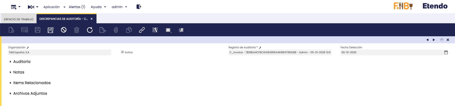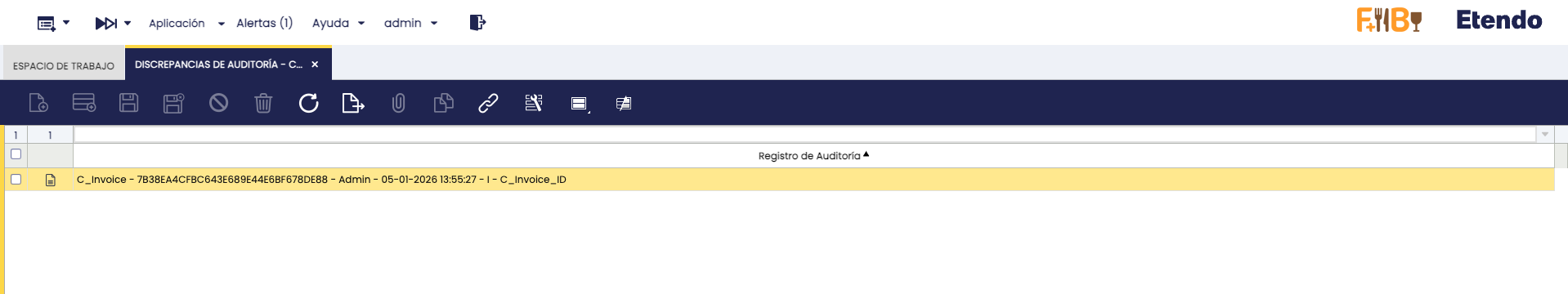 Para revisar esto, el proceso genera el código hash de cada registro de la auditoría y lo compara con el código hash generado automáticamente cuando se creó el registro. Si estos códigos difieren, entonces el sistema detecta que ha ocurrido una discrepancia en la auditoría, y se registra esto en la nueva ventana Aplicación > Configuración General > Seguridad > Discrepancias de Auditoría.