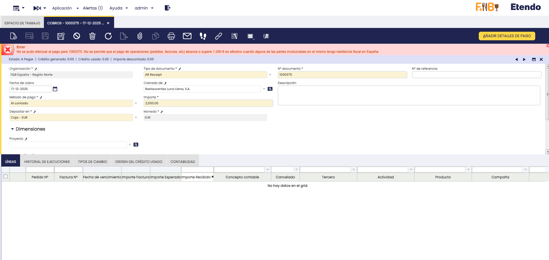 Se ha implementado una validación al realizar pagos/cobros. La misma bloquea pagos en efectivo cuando el total en efectivo (histórico + el que se intenta pagar ahora) de una misma operación llega o supera los 1.000 EUR. Esta restricción se ha realizado en respuesta al siguiente requerimiento de la Ley 11/2021, de 9 de julio, de medidas de prevención y lucha contra el fraude fiscal, en su artículo XV: