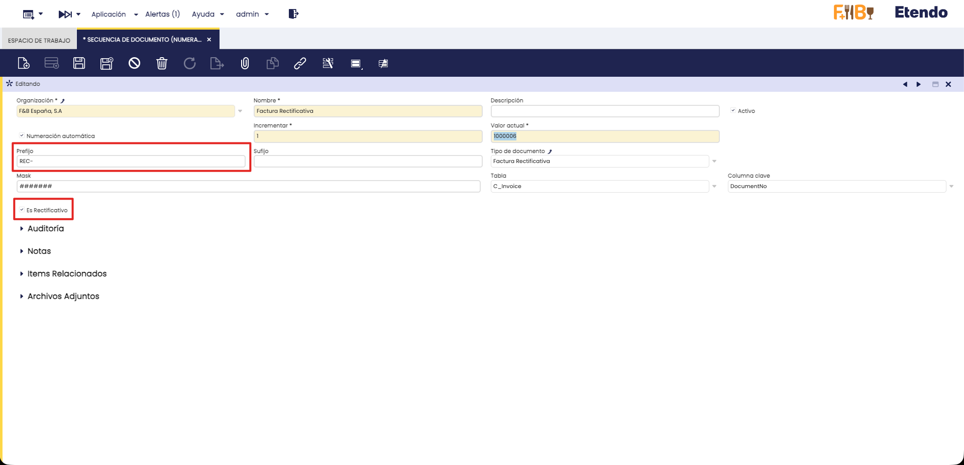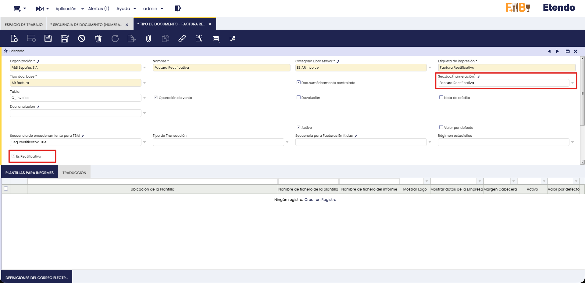 Acceder a la ventana "Tipo de Documento". En esta ventana se deberá crear un nuevo tipo o elegir uno existente, el cual será utilizado exclusivamente para facturas rectificativas. Se debe marcar la casilla "Es Rectificativo" en el tipo de documento creado/elegido para que el sistema permita usarlo en rectificaciones. Si no se utilizan secuencias transaccionales, se debe asignar en el campo "Sec. Doc. (Numeración)" la secuencia rectificativa creada anteriormente. Esta secuencia sólo aparecerá si se ha marcado la casilla "Es Rectificativo" tanto en la secuencia como en el tipo de documento.