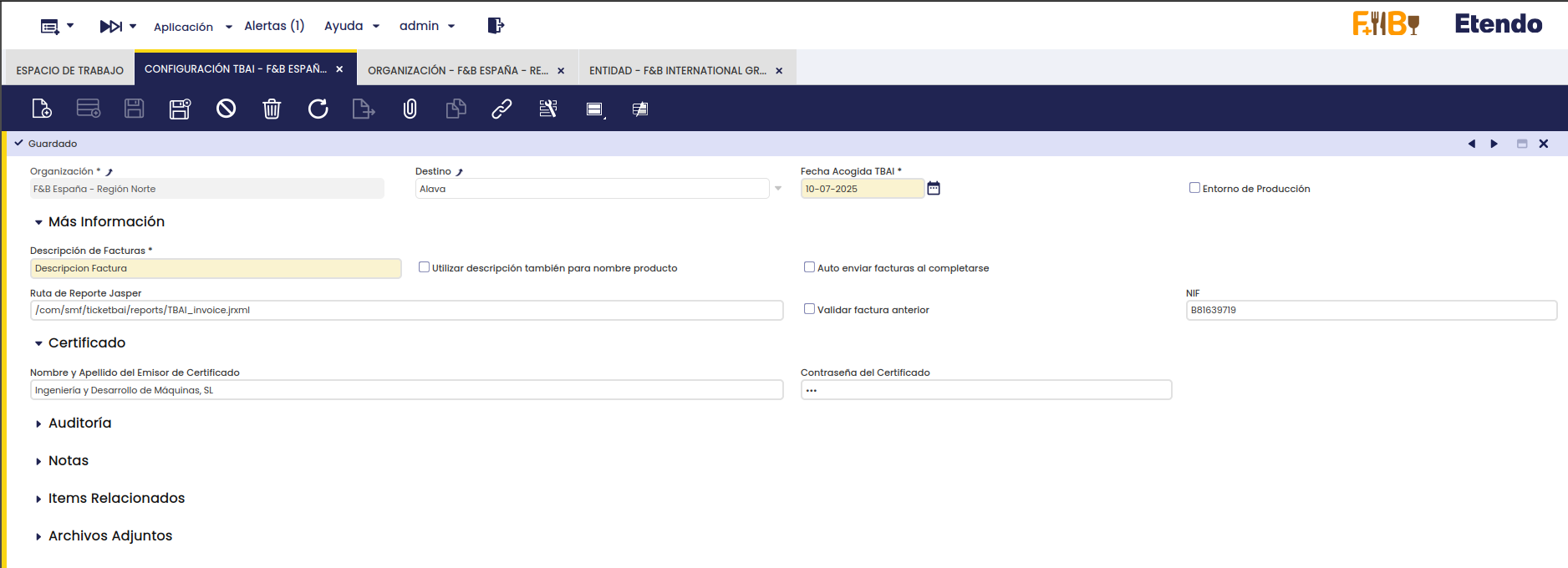 Configuración TBAI, donde se podrán configurar todos los parámetros necesarios para el envío correcto de los registros de facturas a TicketBai/Batuz, incluyendo los destinos Gipuzkoa, Bizkaia y Álava.