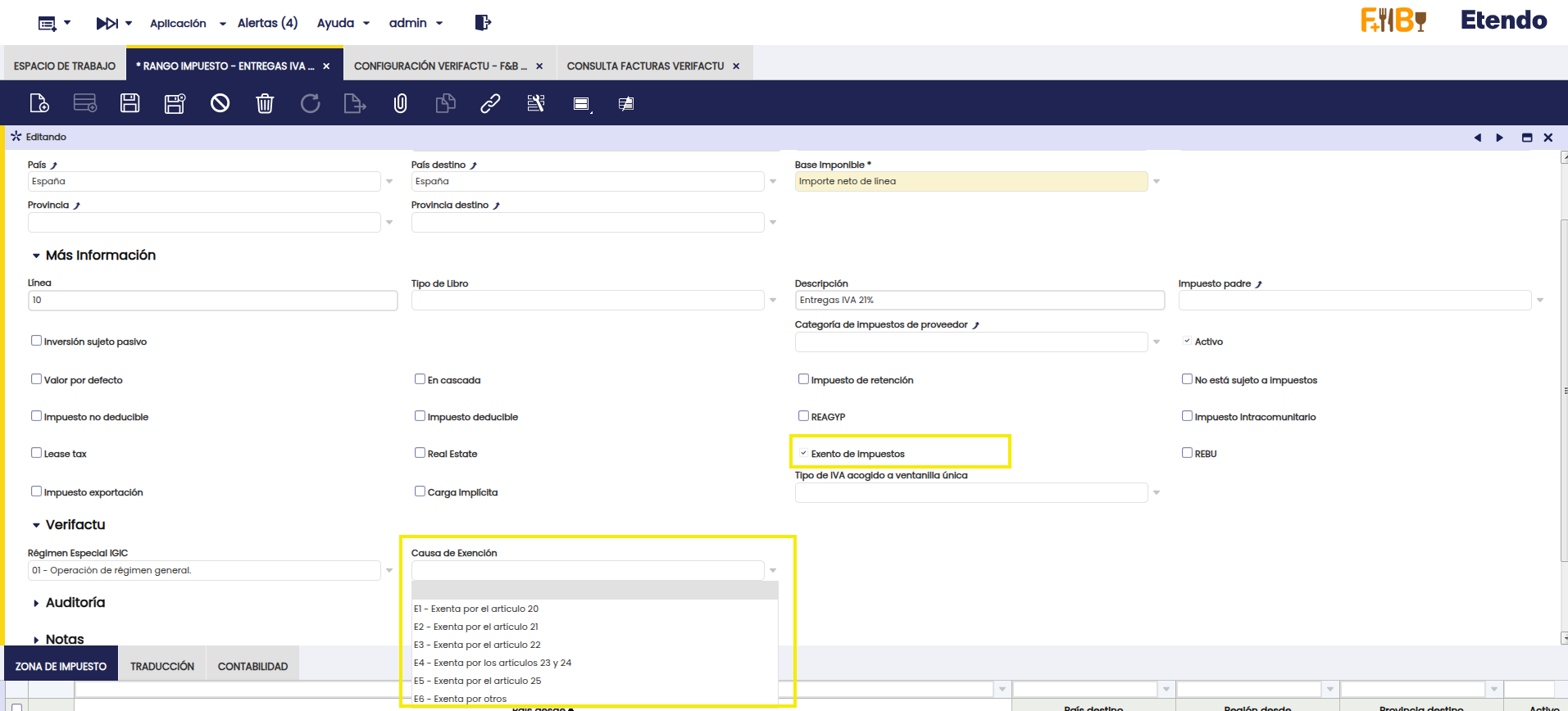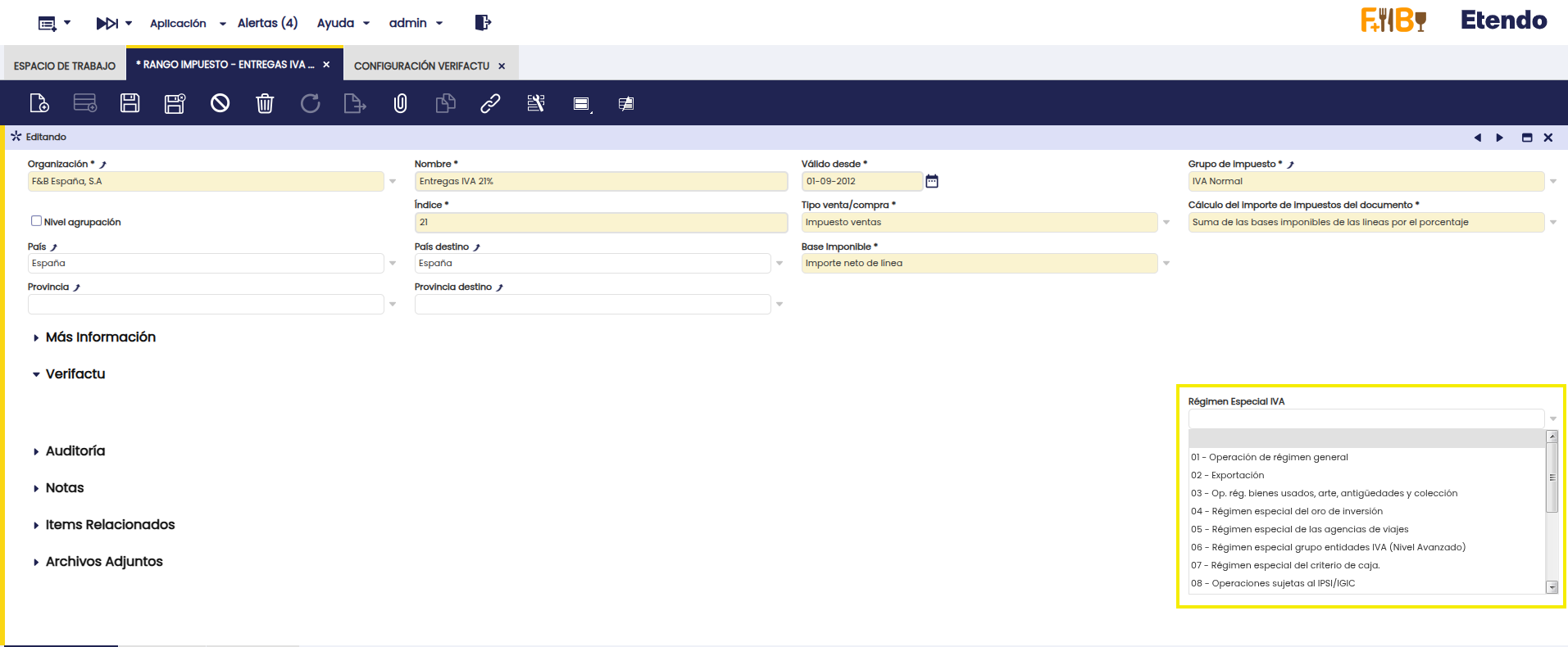 Se añaden campos y pestañas específicas de Verifactu en las ventanas Factura (Cliente), Rango de Impuesto, Tipo de Documento, Pedido de Venta.