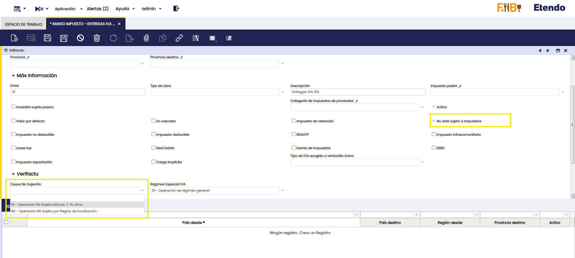 Si se utilizan recargos de equivalencia, basta con completar el campo en el impuesto principal. Por ejemplo, para el impuesto Entregas IVA+RE 21+5.2%, que incluye los subimpuestos Entregas IVA+RE 21+5.2% (+21%) y Entregas IVA+RE 21+5.2% (+5.2%), solo es necesario rellenar el campo en el impuesto Entregas IVA+RE 21+5.2% (+21%).