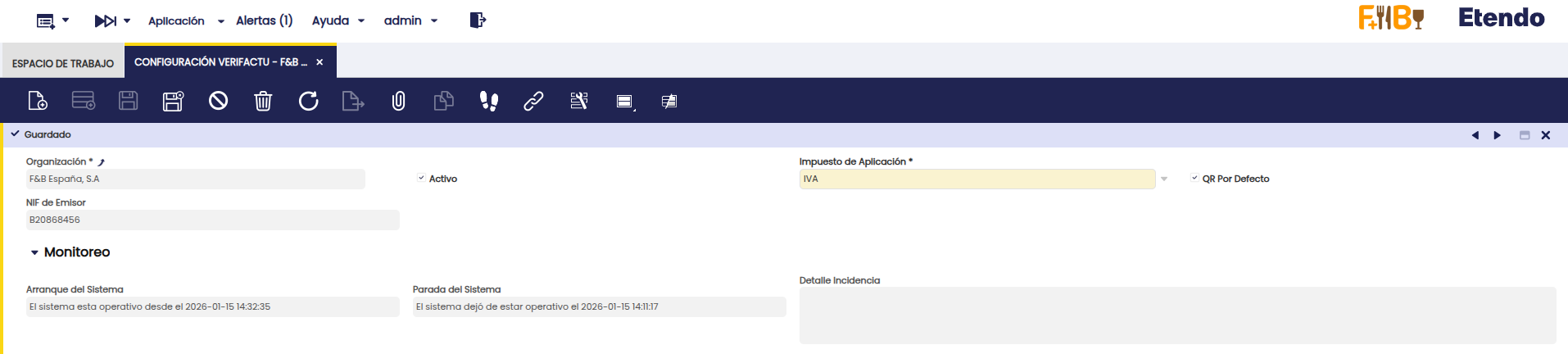 Además, existe una sección de Monitoreo donde los campos Arranque del Sistema y Parada del Sistema indican, respectivamente, cuándo el entorno comenzó a estar operativo y cuándo dejó de estarlo. Esta información es útil para identificar con precisión los períodos en los que Verifactu estuvo disponible y aquellos en los que no lo estuvo.