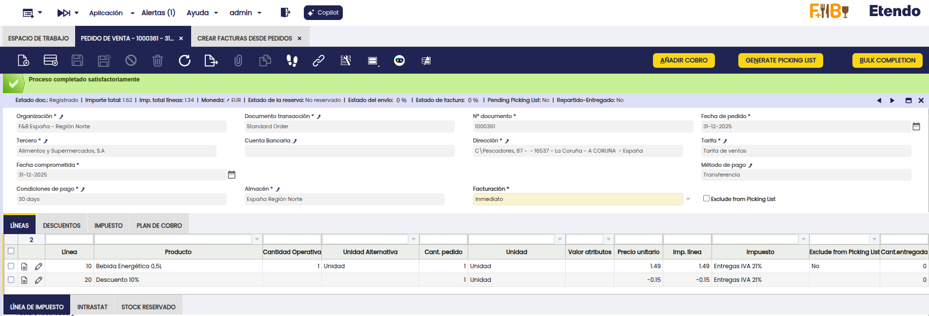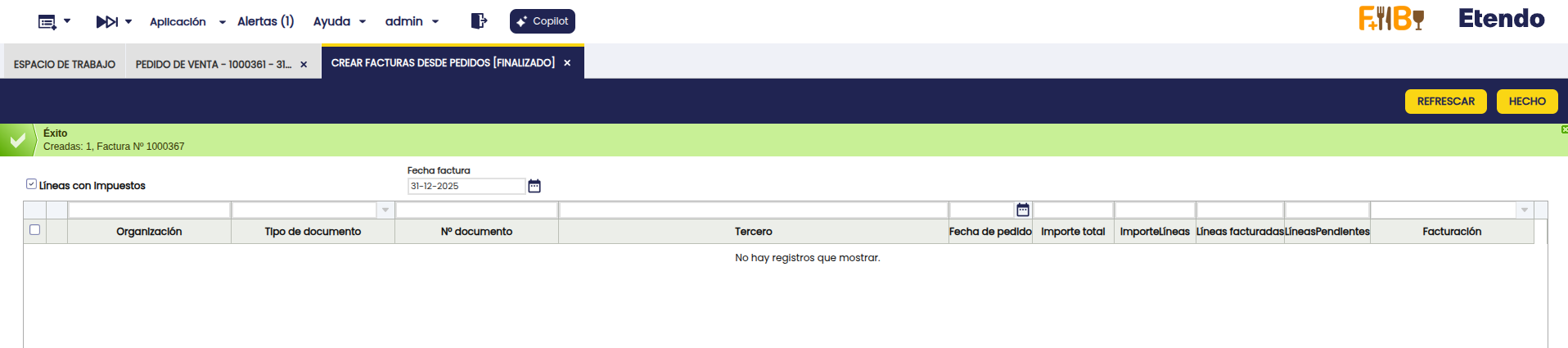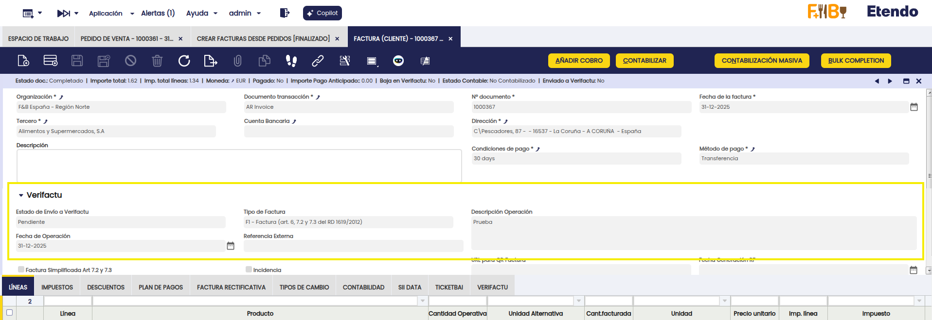 Con esta configuración, al generar la factura desde el pedido o la devolución, el sistema emitirá automáticamente una factura rectificativa, utilizando la configuración definida en el tipo de documento.
